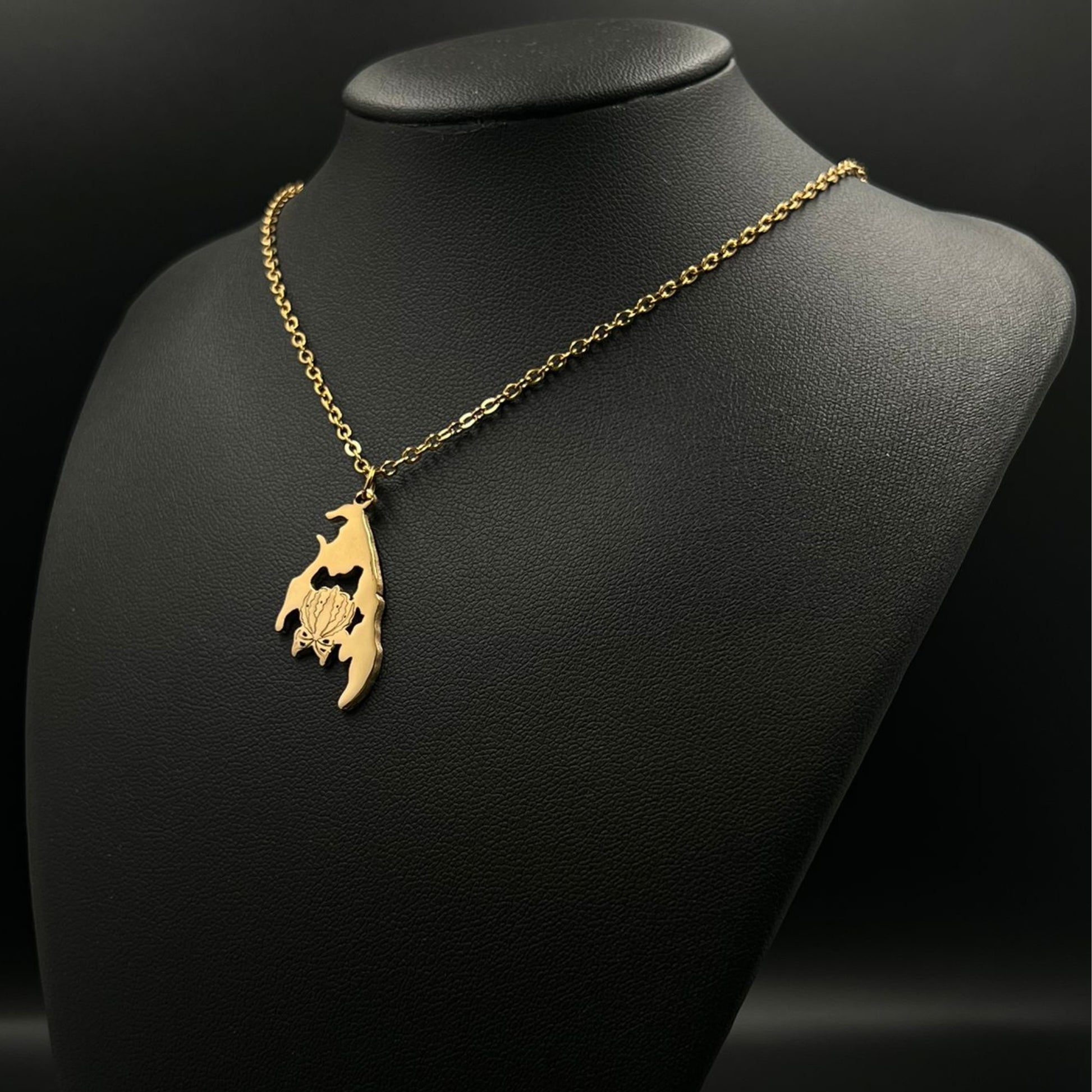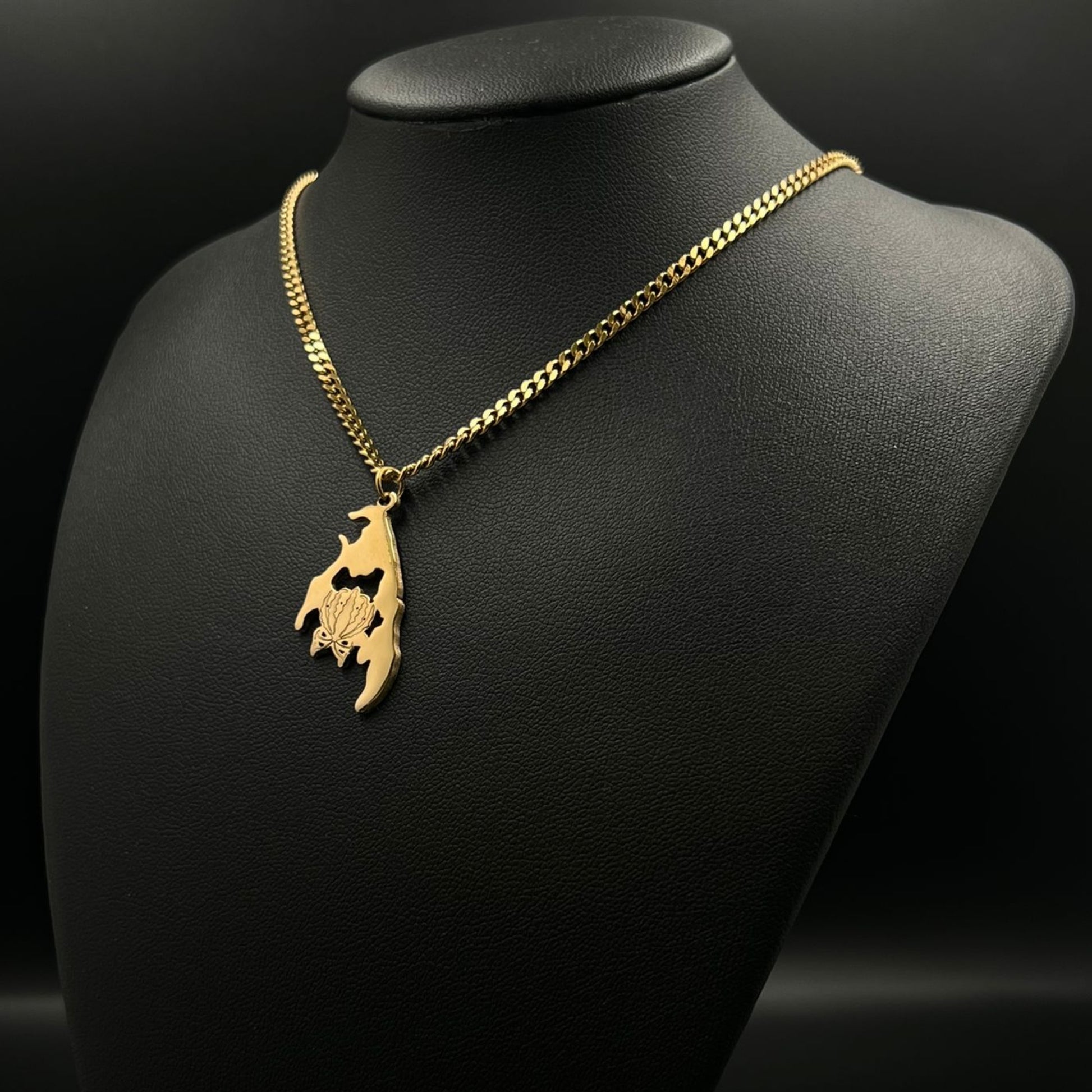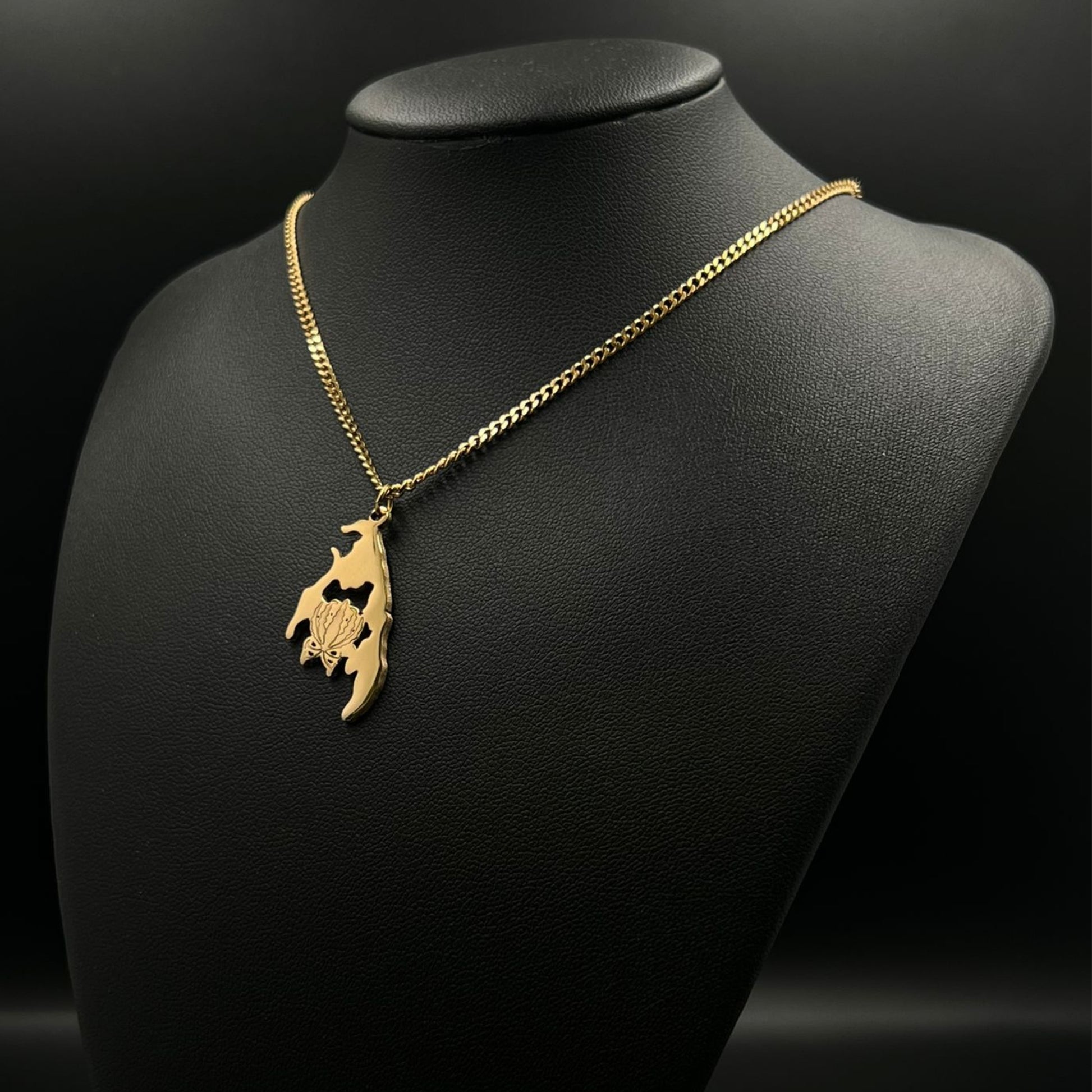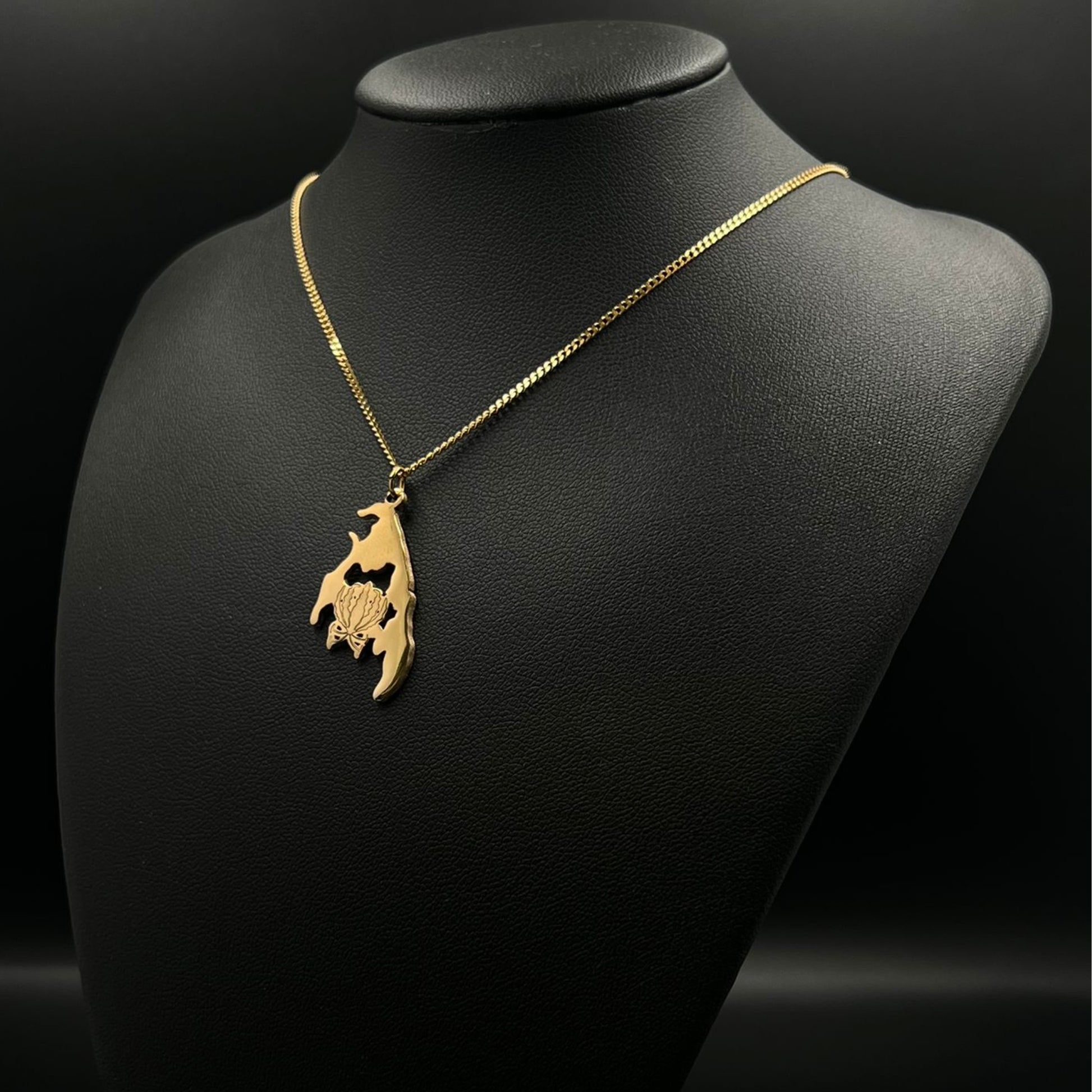 The chain and pendant are 18-carat gold or rhodium-plated and feature a map of Tamil Eelam with the Karthigai flower in the middle.