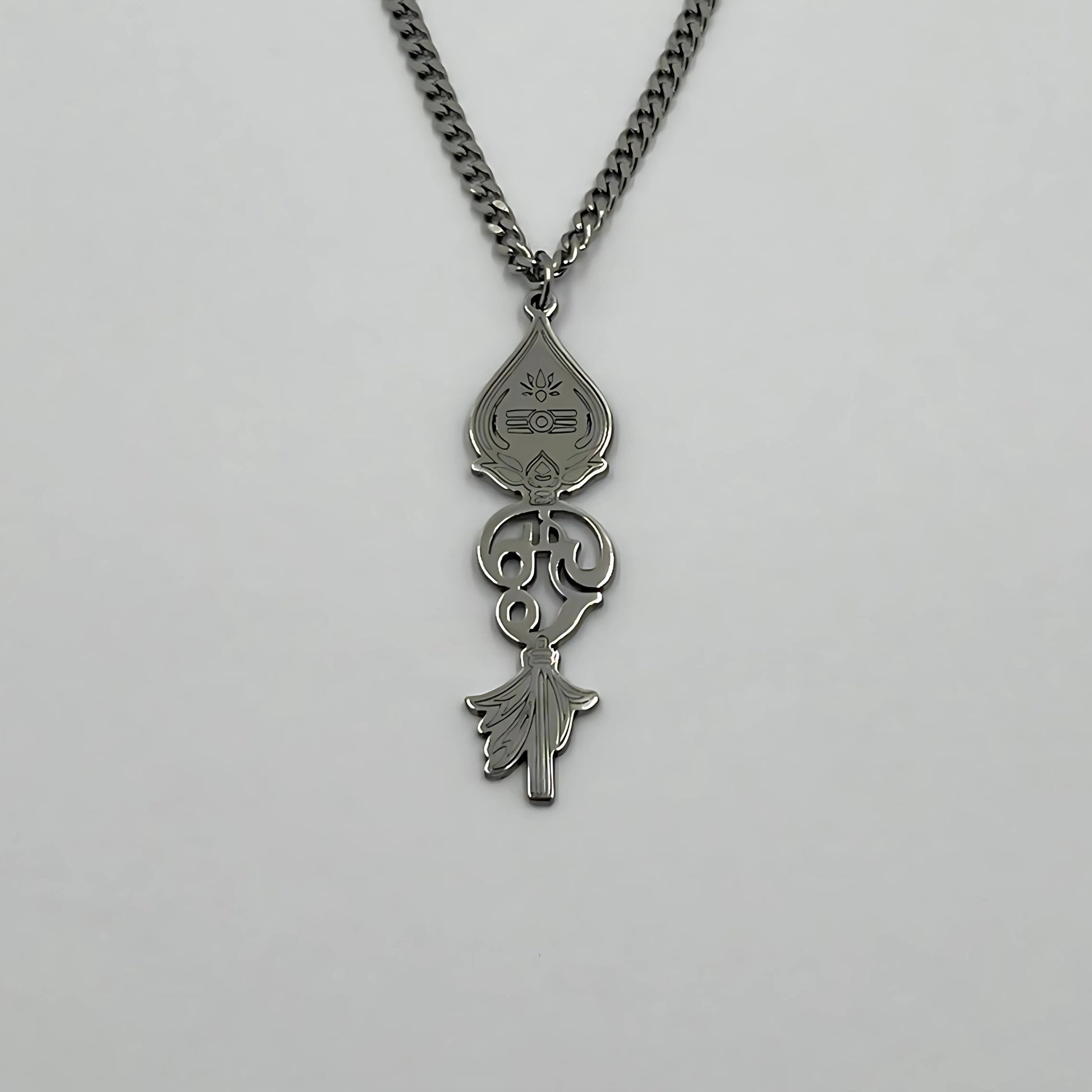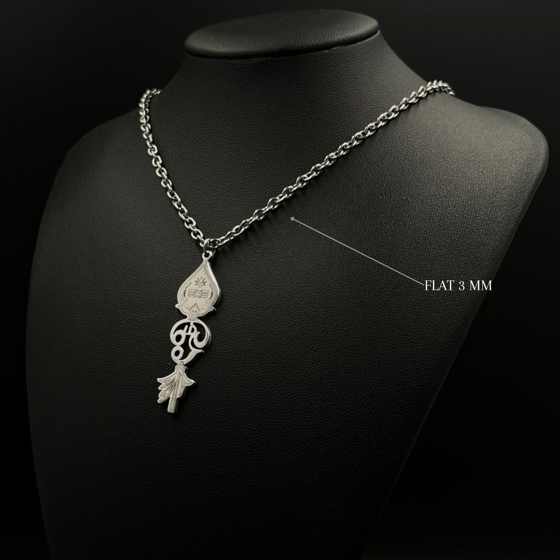 The chain and pendant are 18-carat gold or rhodium-plated and represent the “Om” with the Vel.