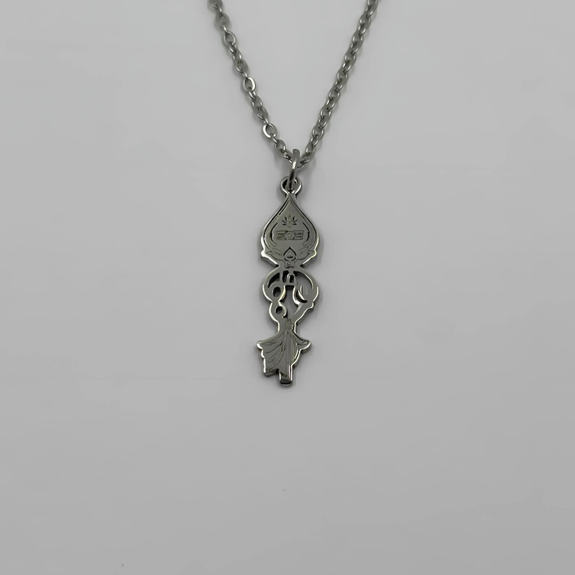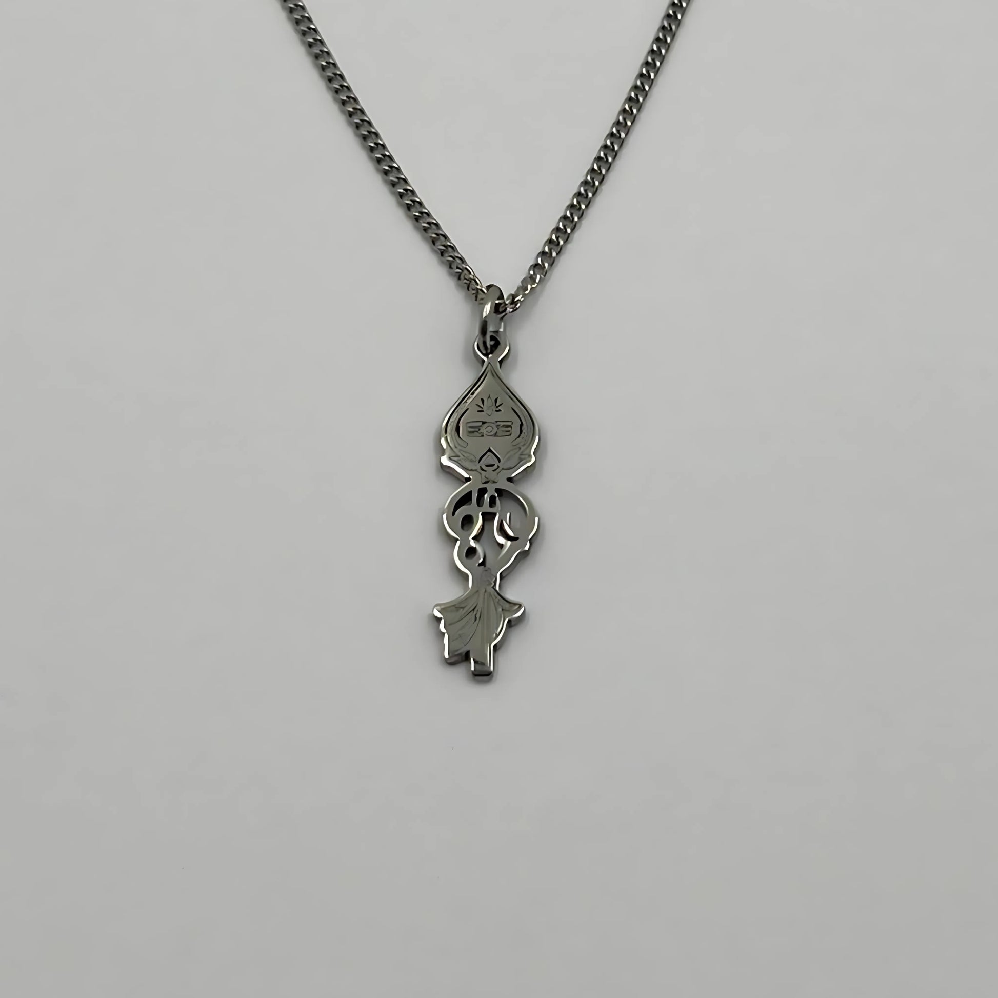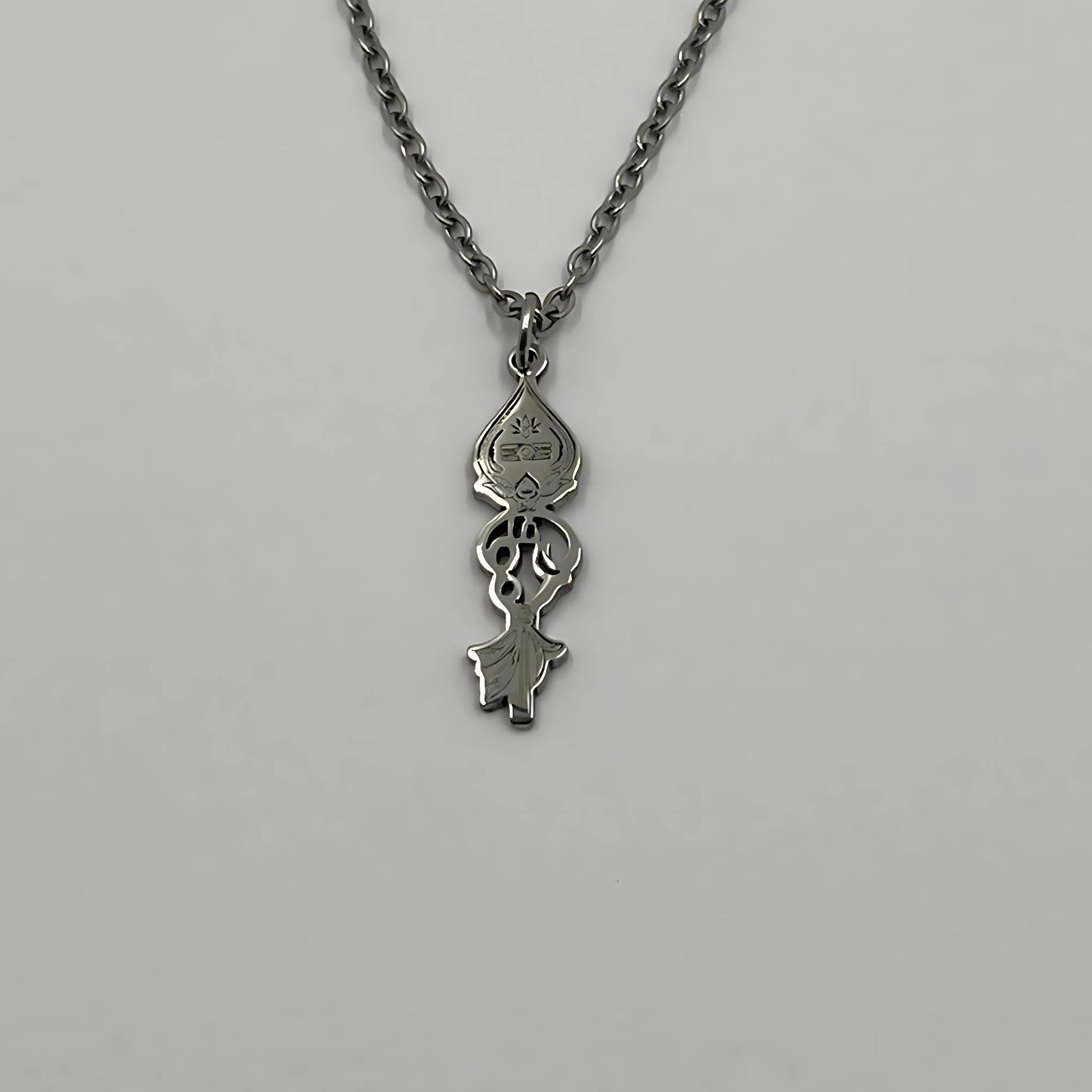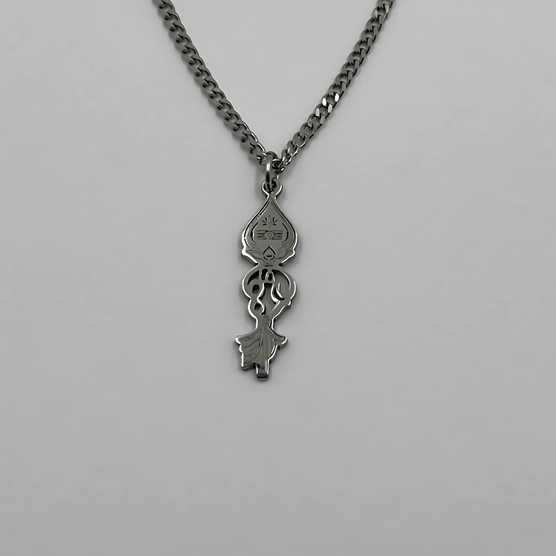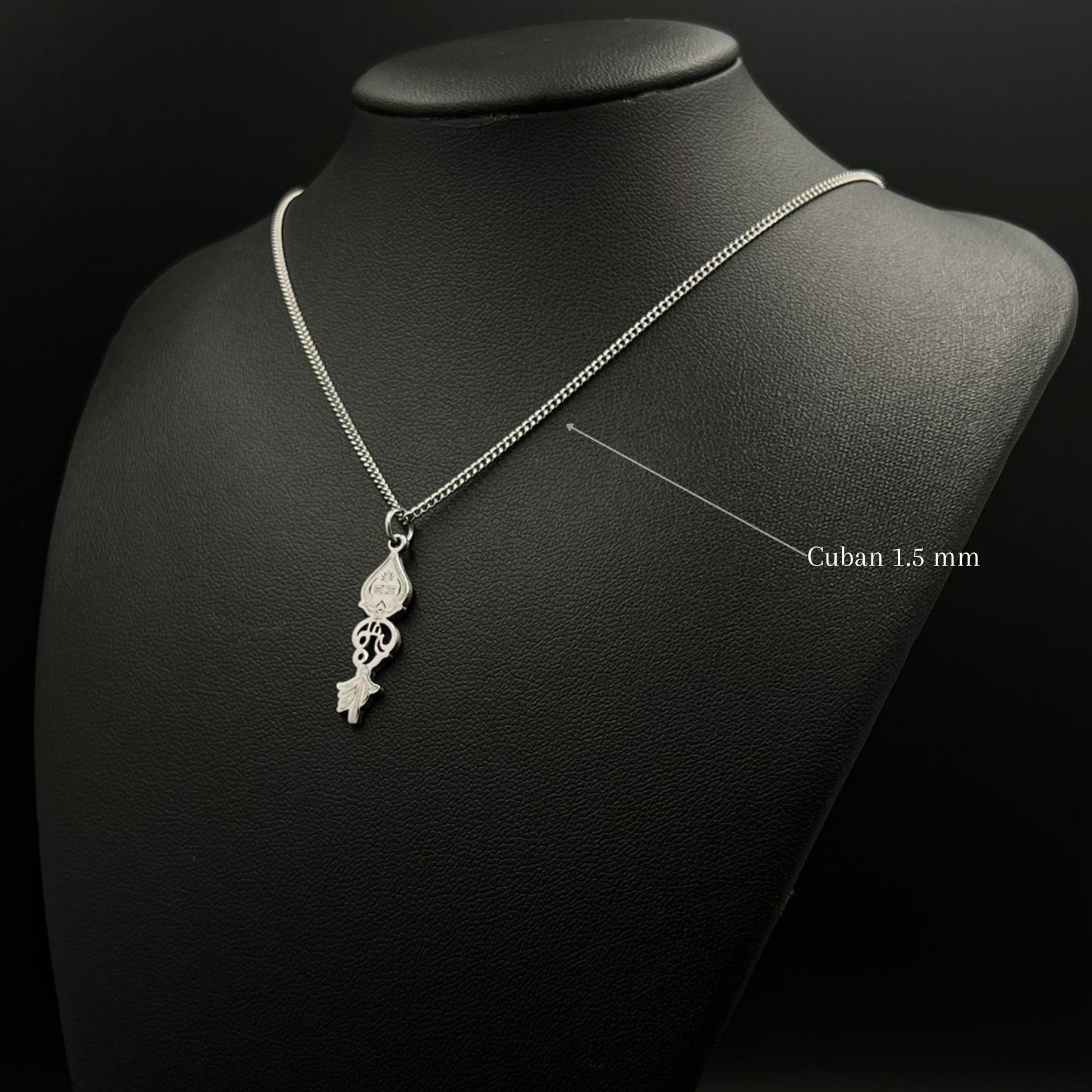The chain and pendant are 18-carat gold or rhodium-plated and represent the “Om” with the Vel.
