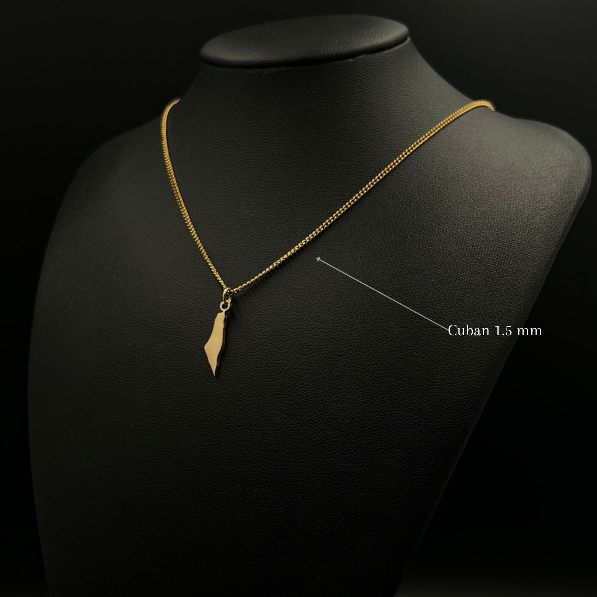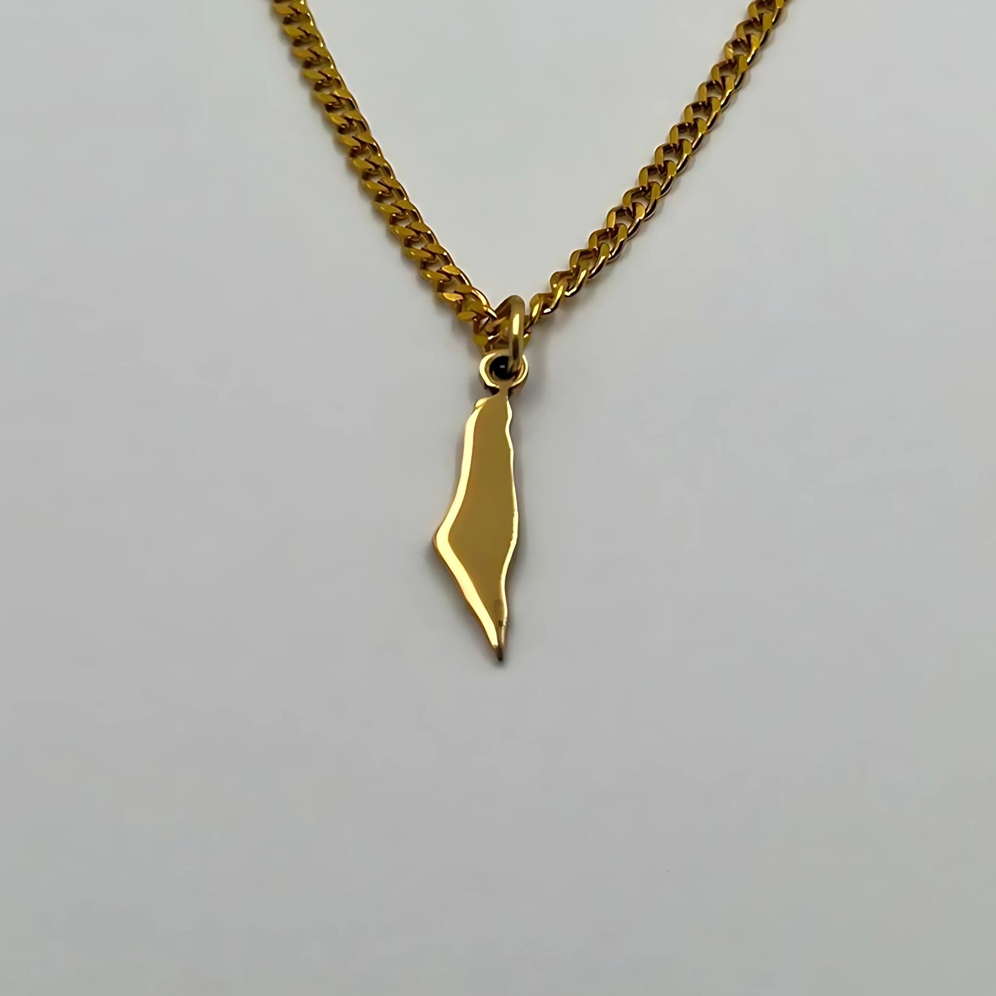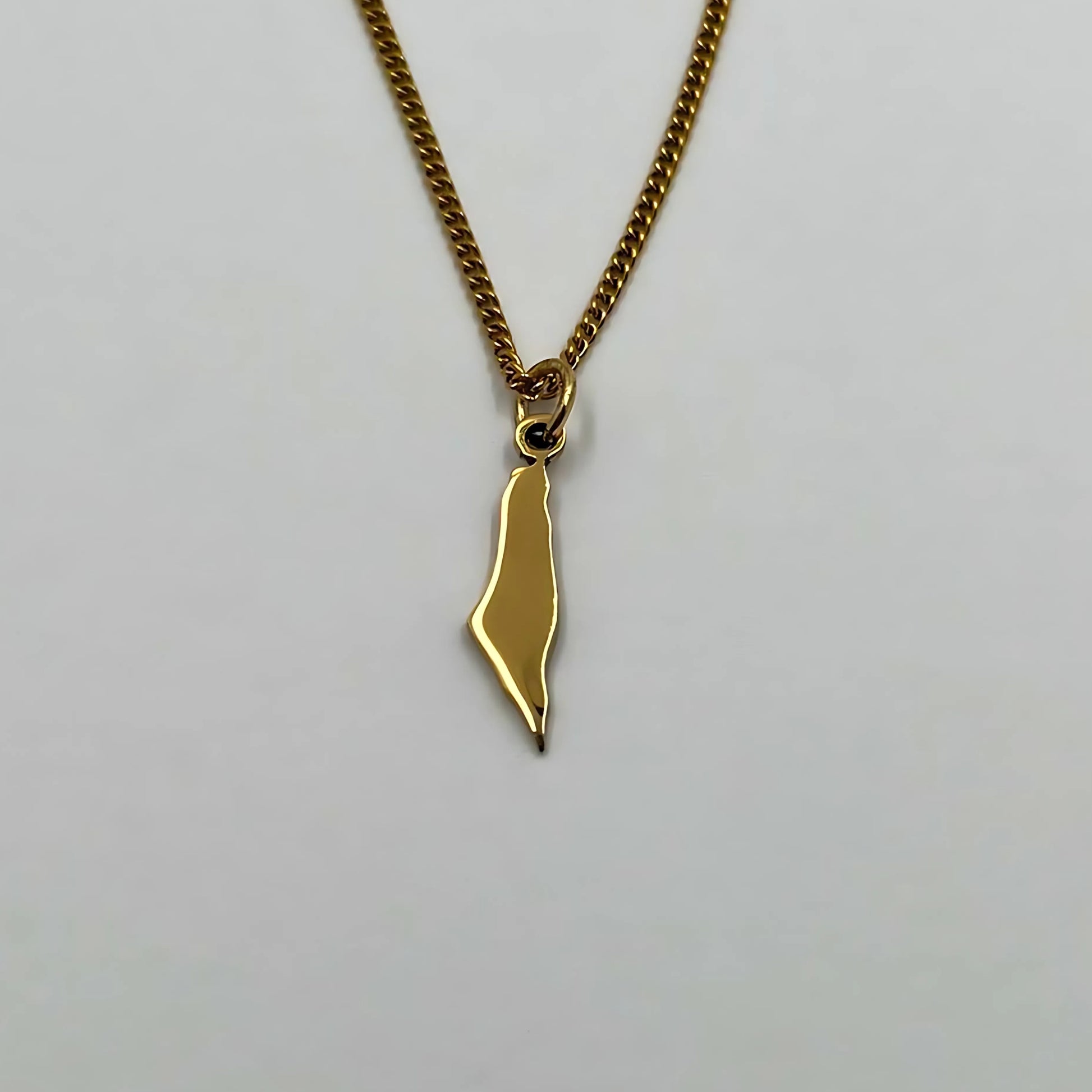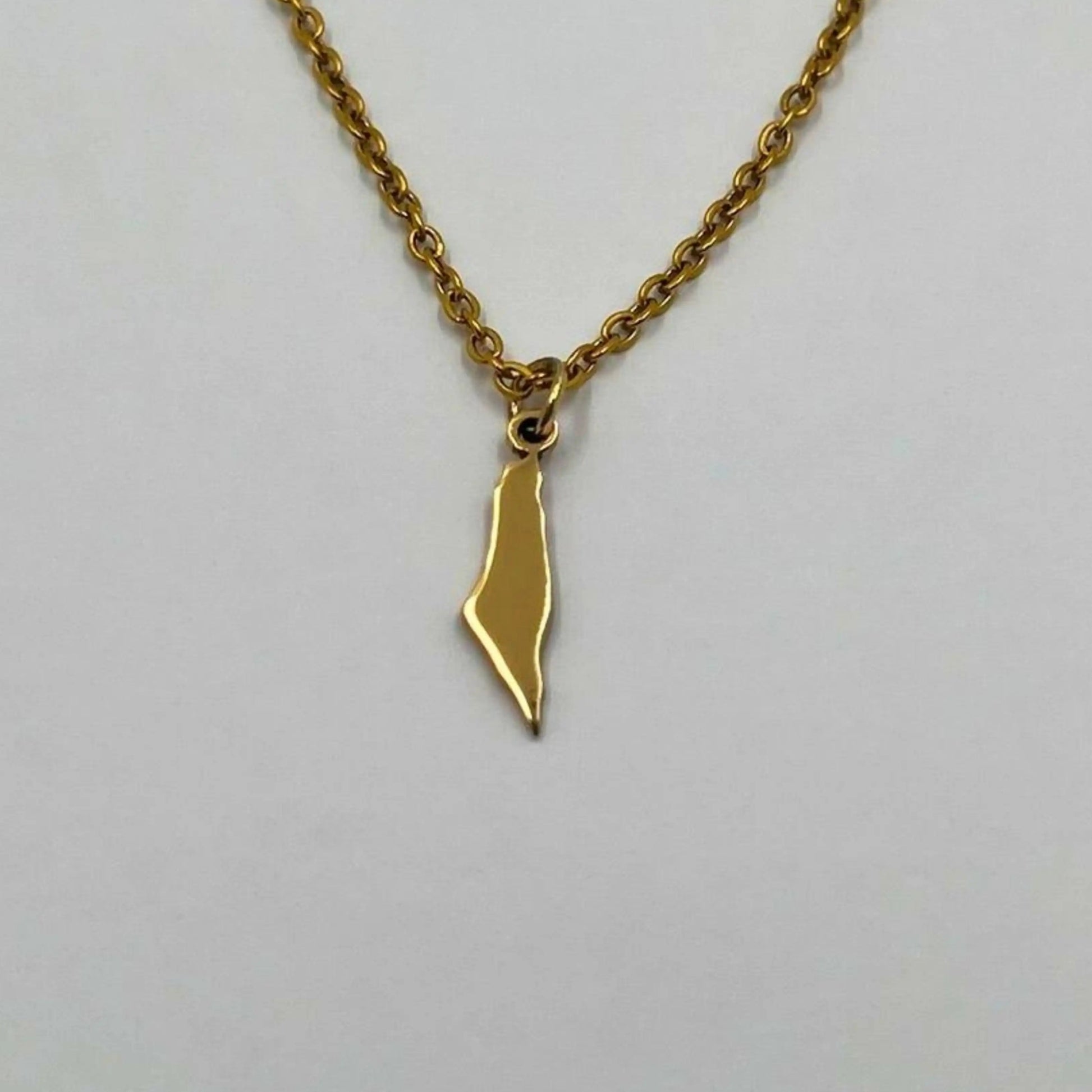 The chain and pendant are 18-carat gold or rhodium-plated and feature the Palestine map.