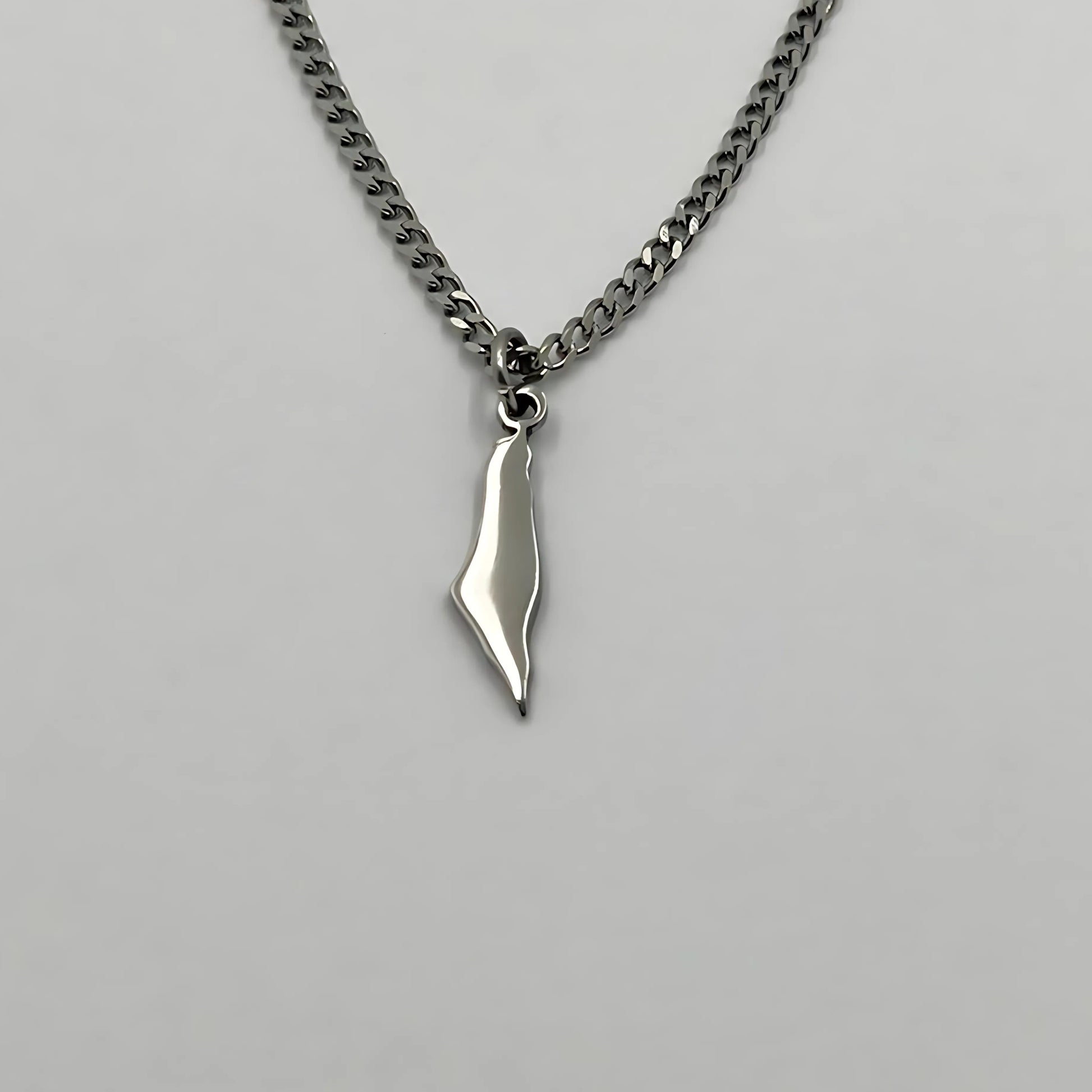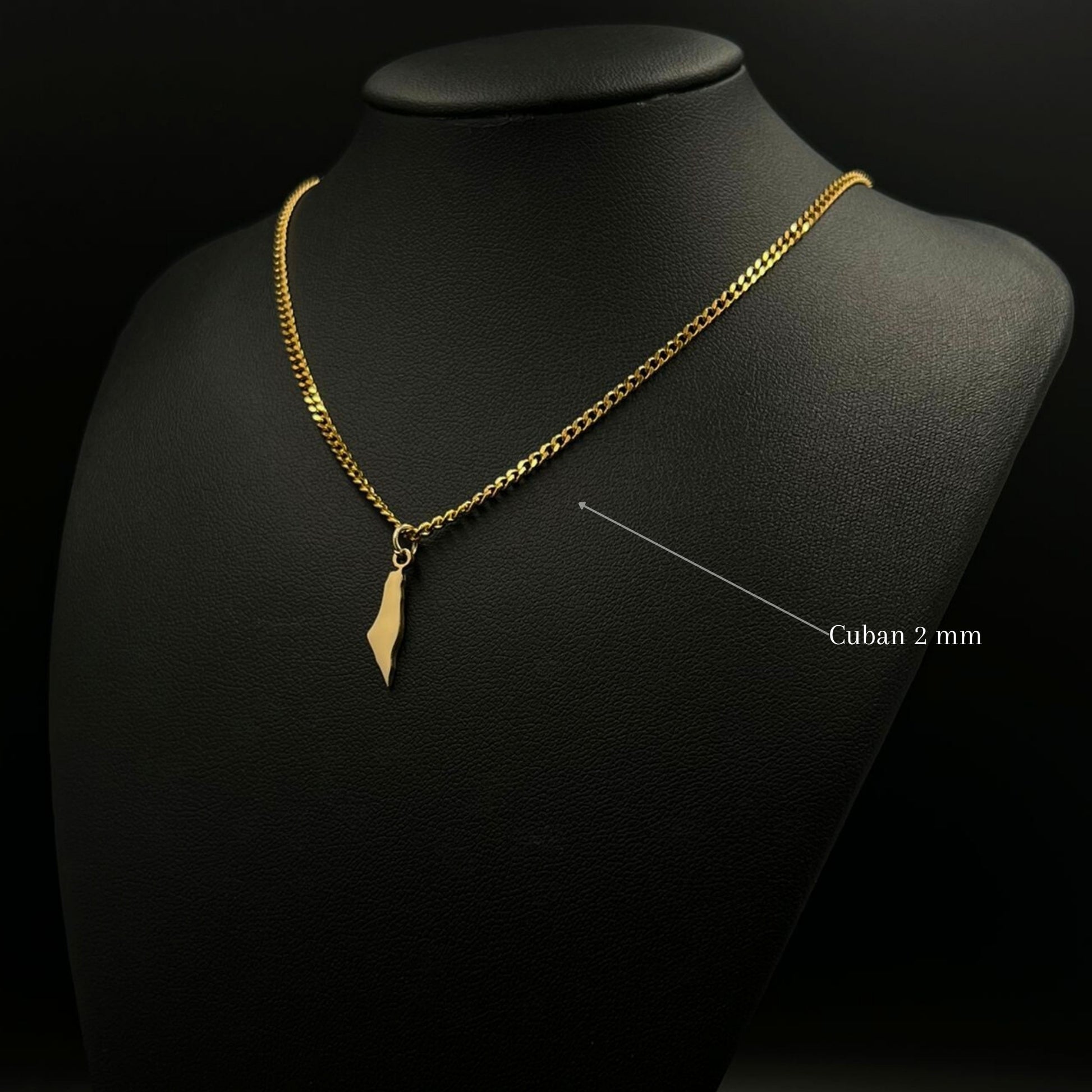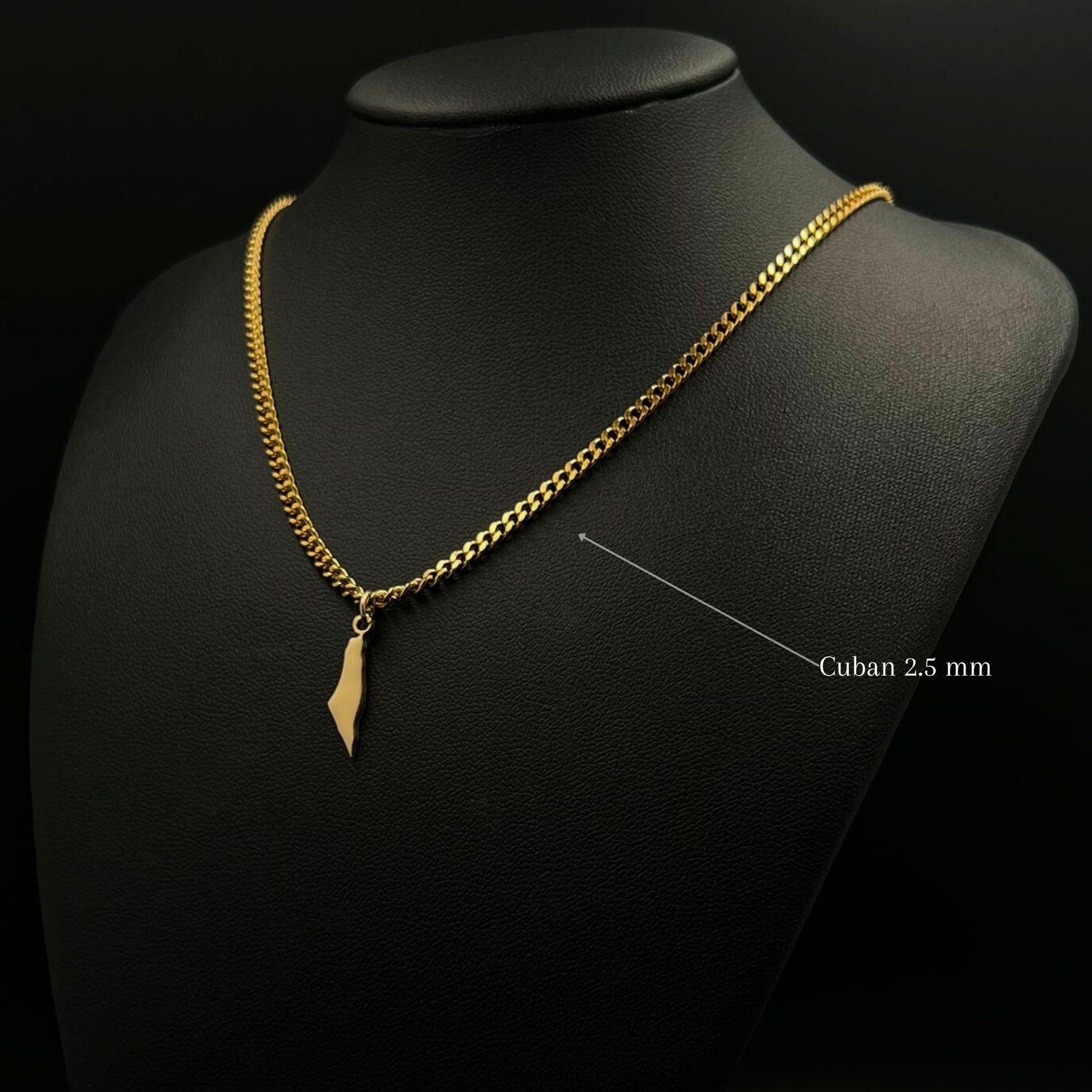 The chain and pendant are 18-carat gold or rhodium-plated and feature the Palestine map.