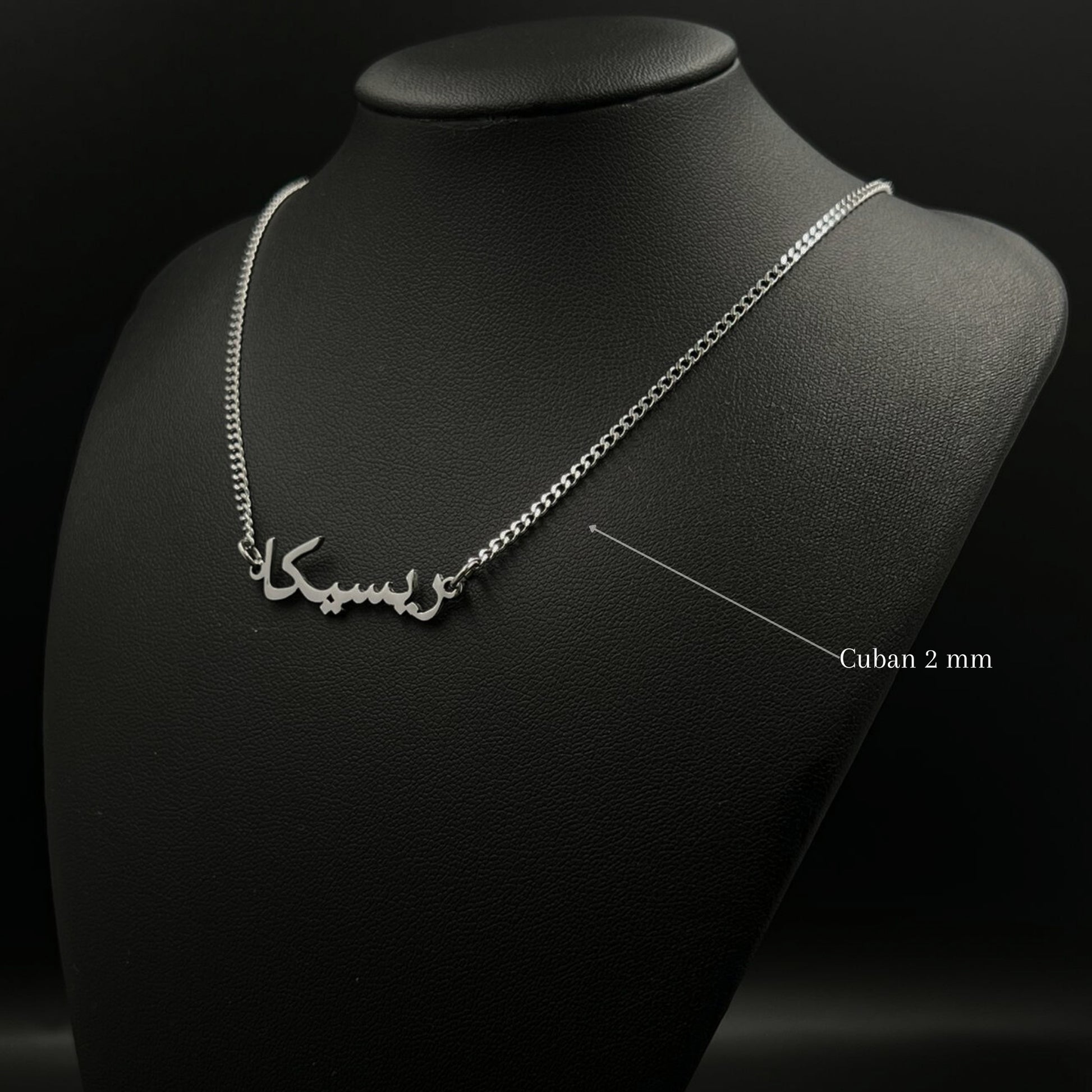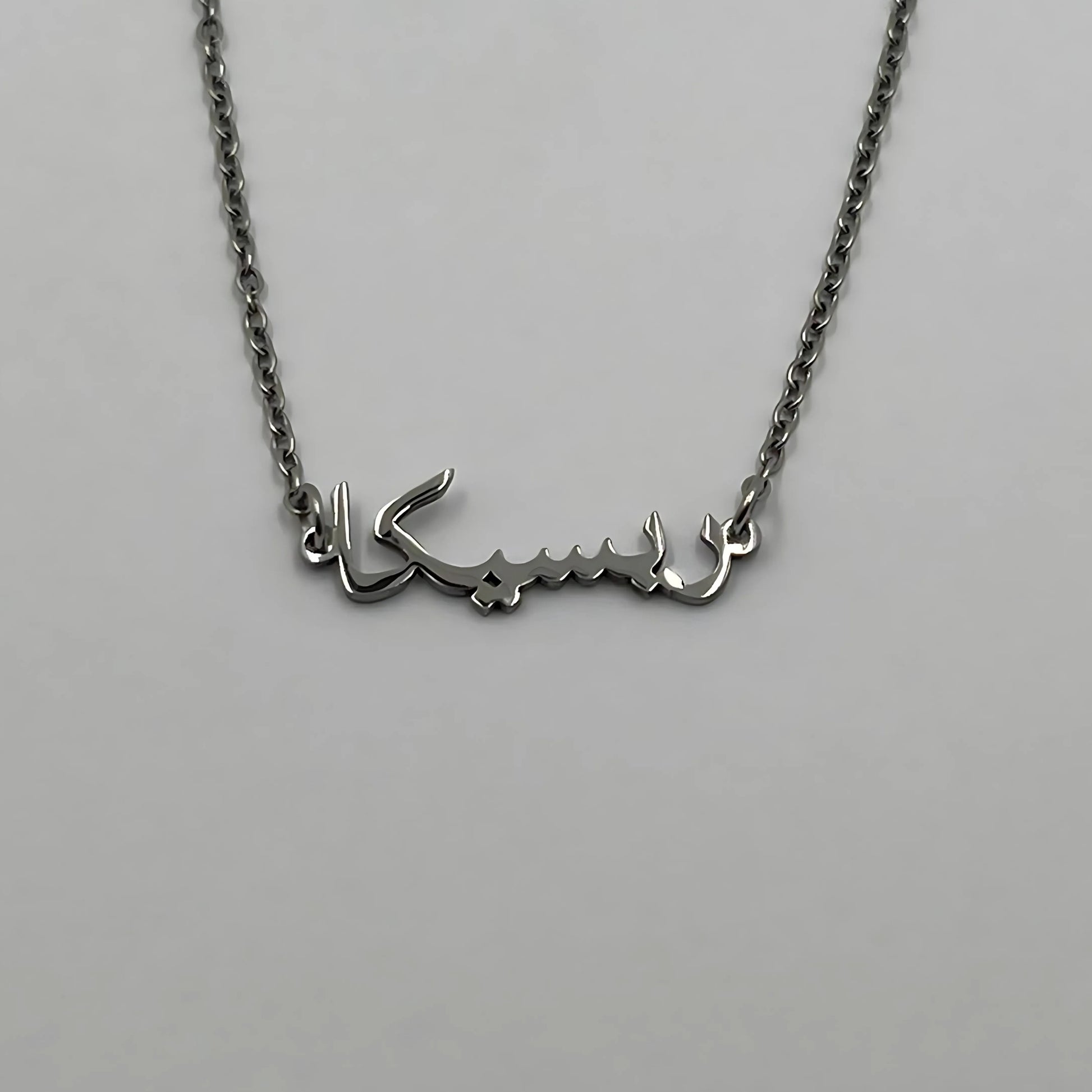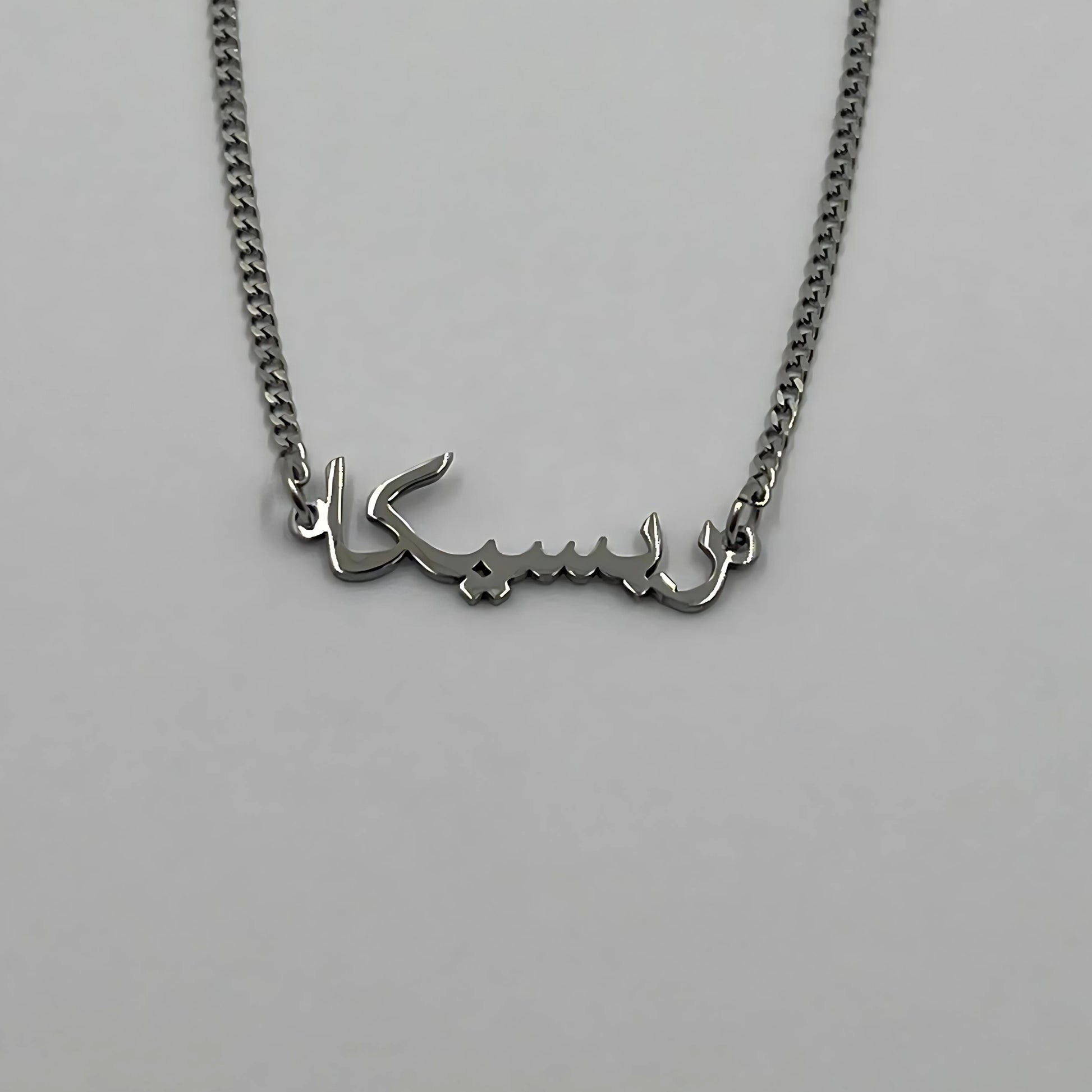The necklace is 18-carat gold or rhodium-plated and features your name in Arab.
