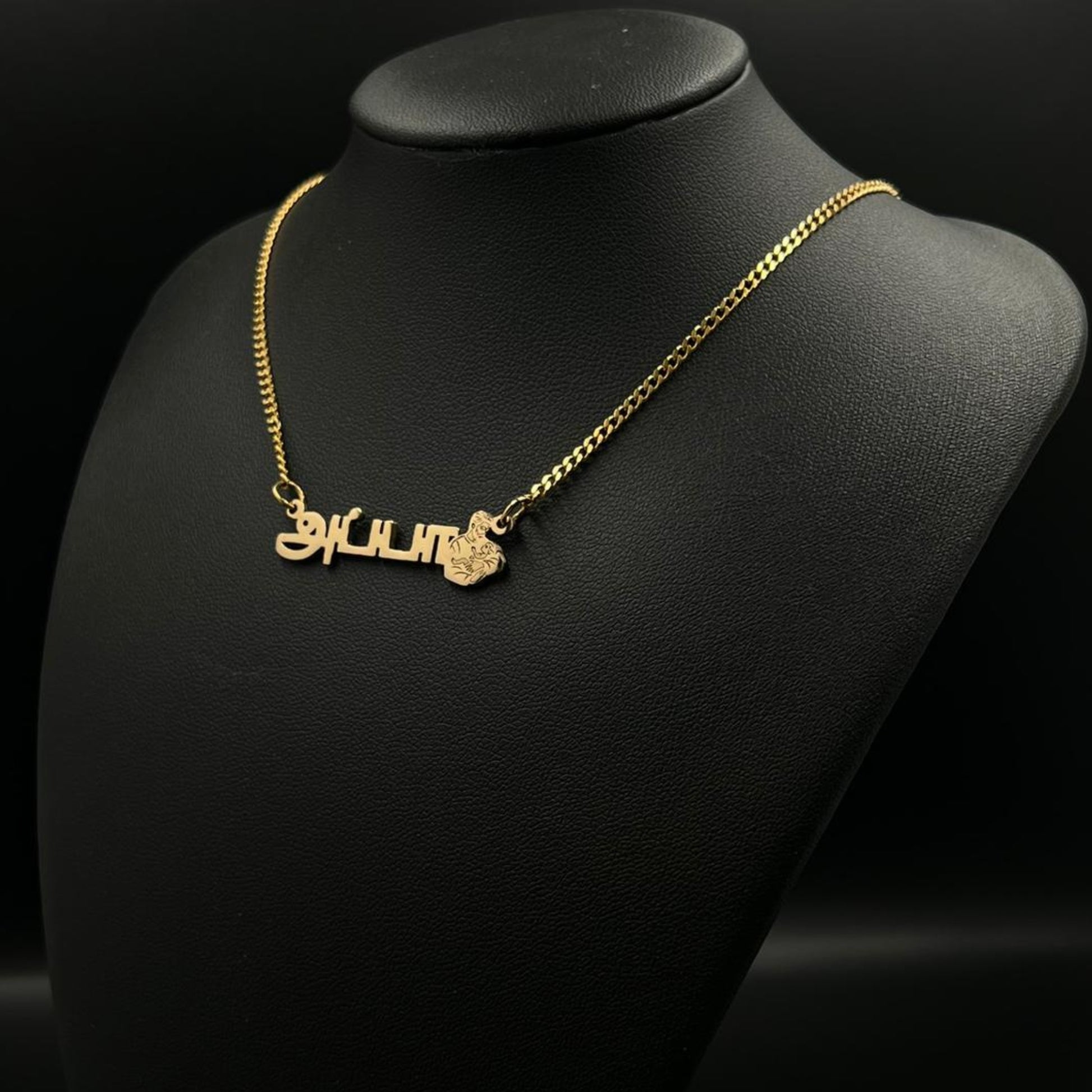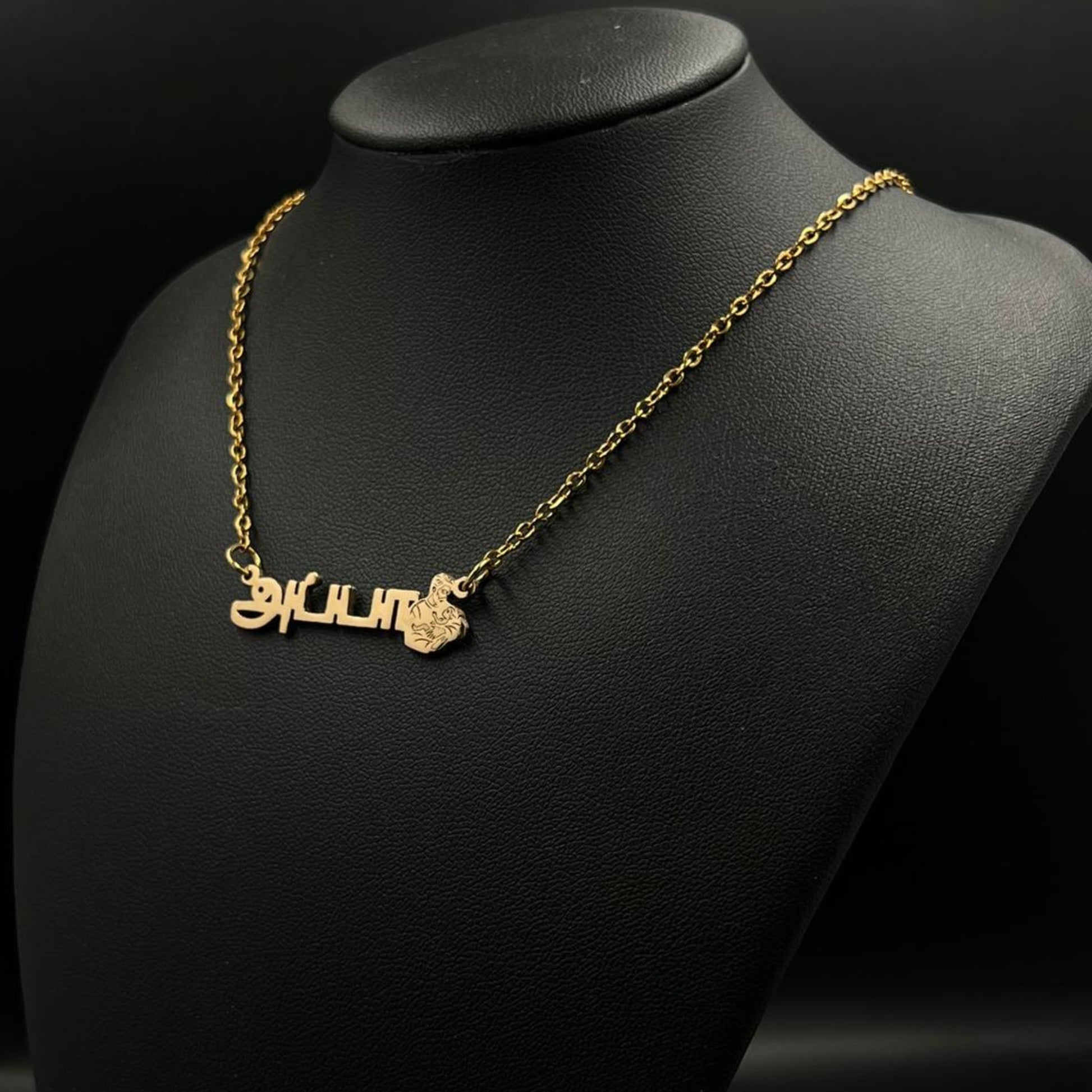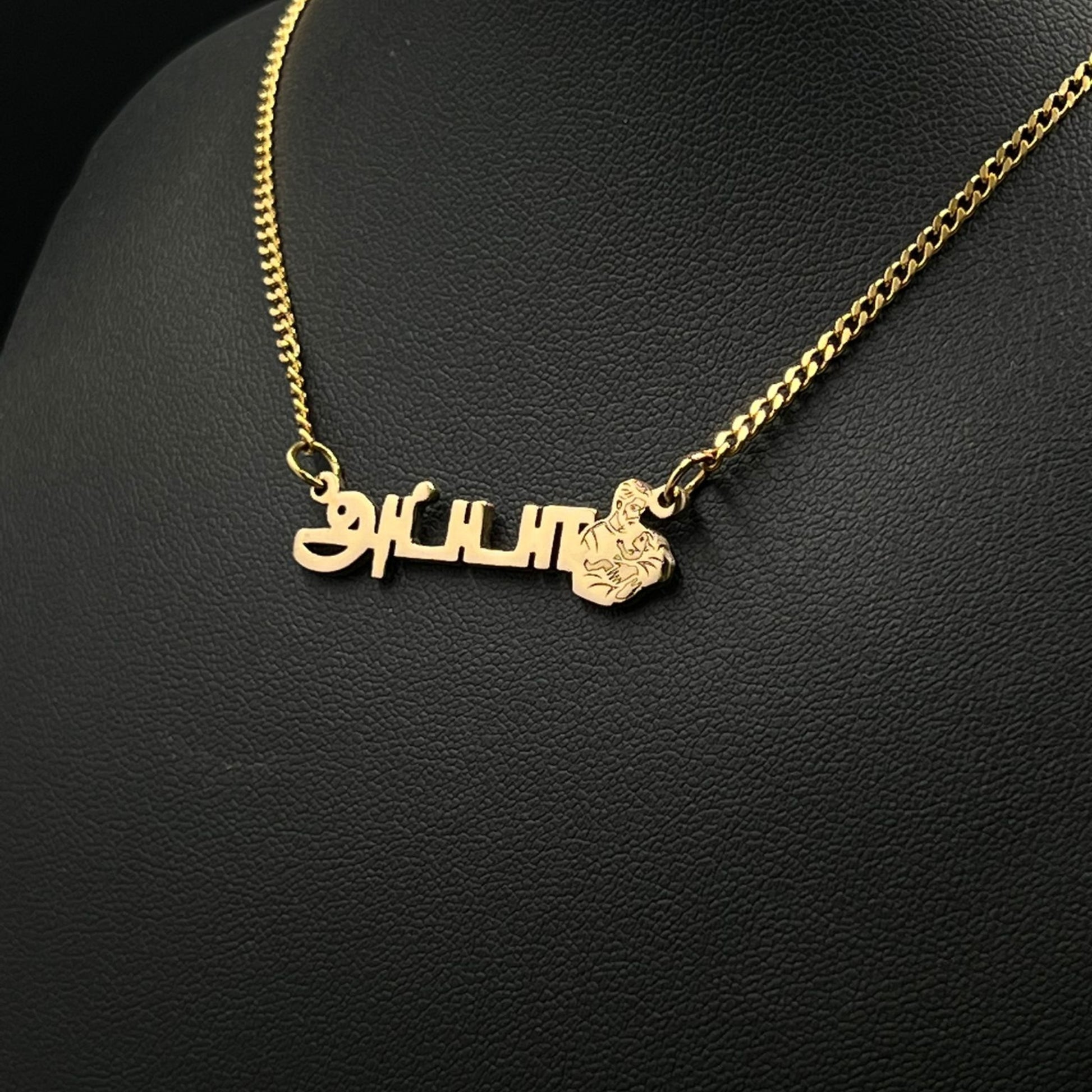 The necklace is 18-carat gold or rhodium-plated and features your name with a father figure holding his baby in his arms.