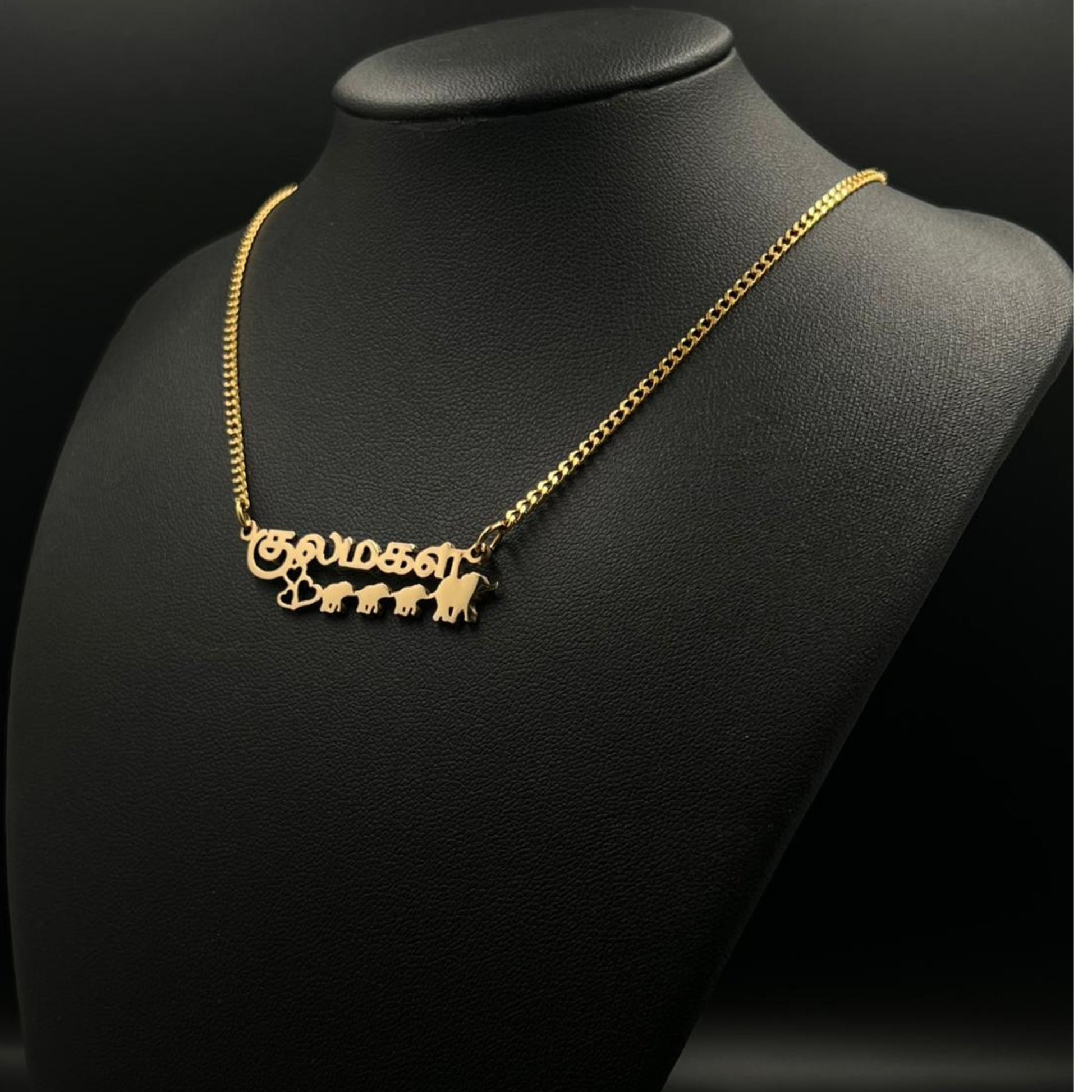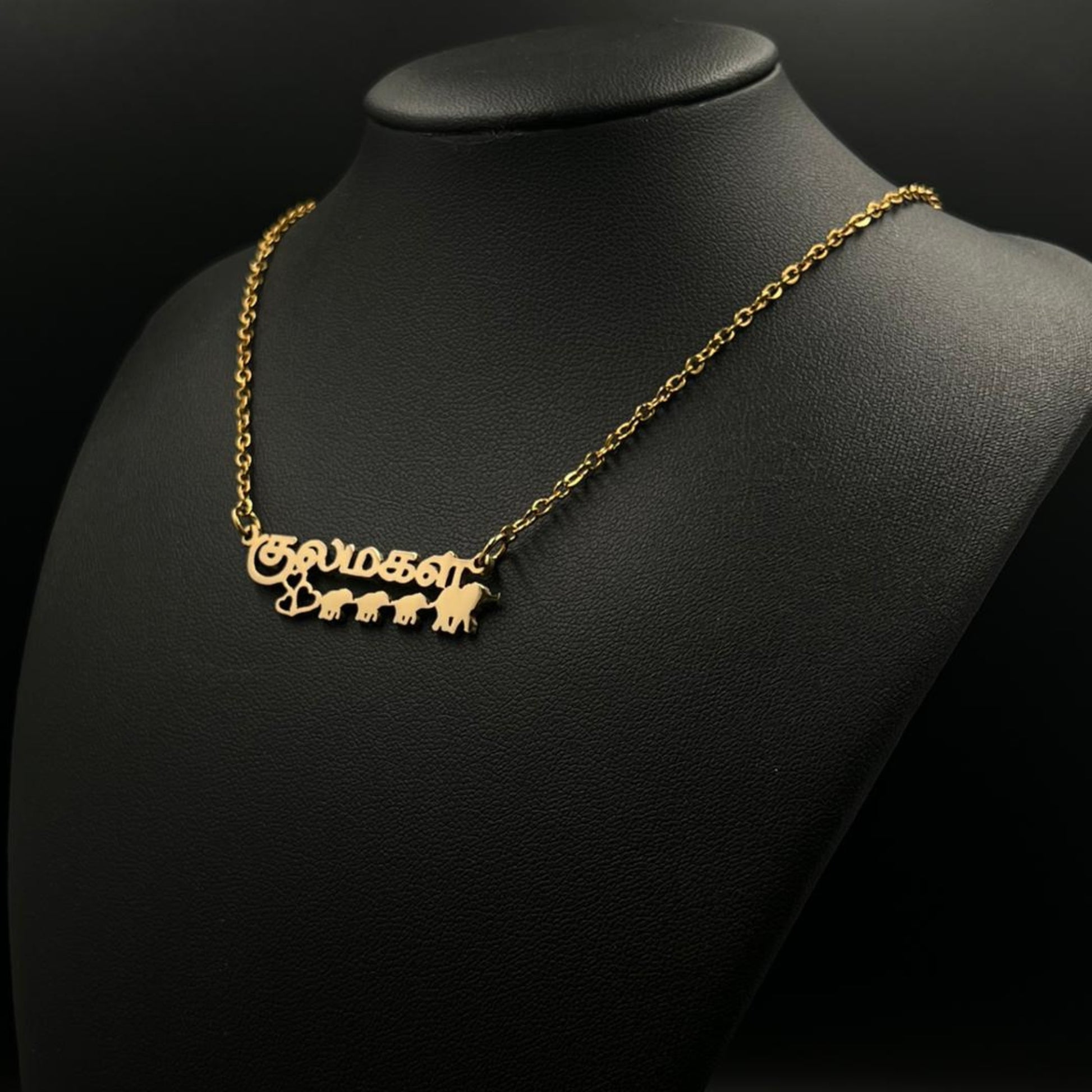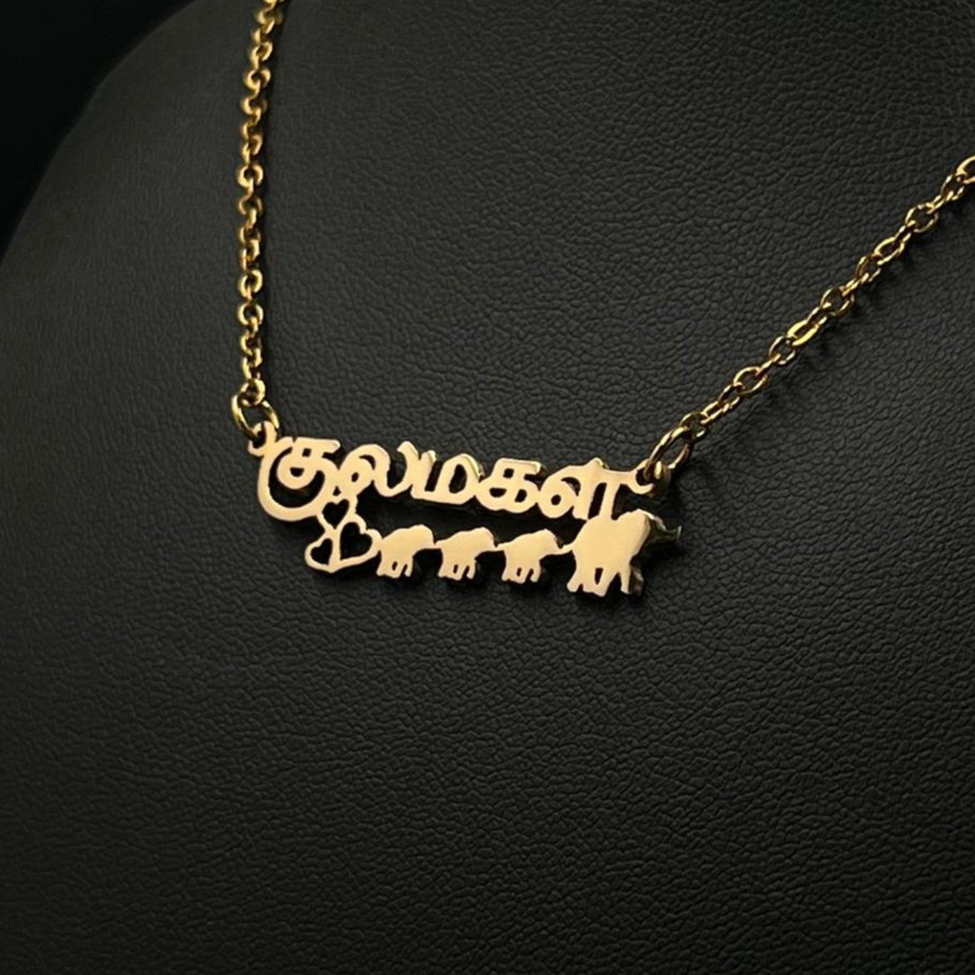 The necklace is 18-carat gold or rhodium-plated and features your name with a mother elephant accompanied by her three children.