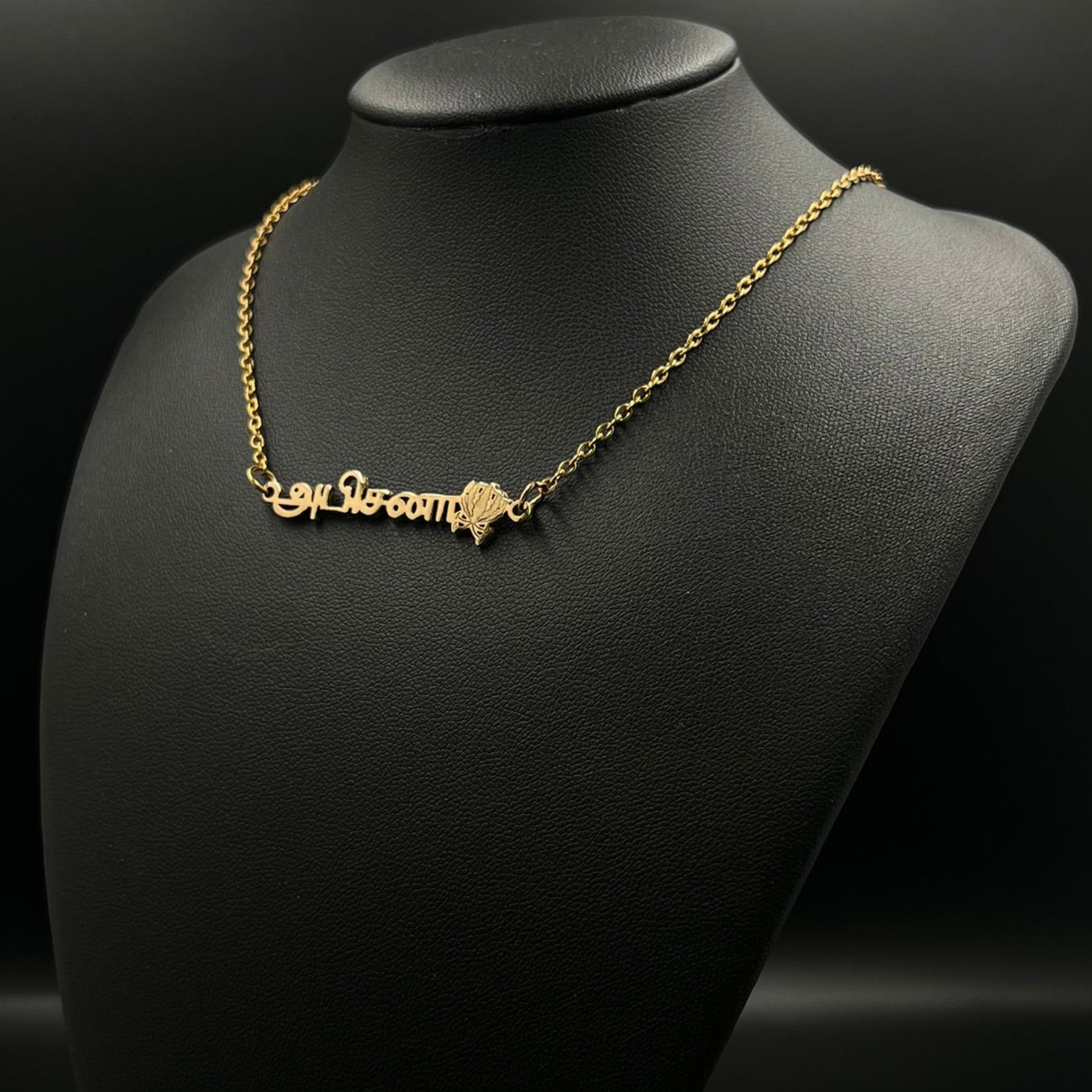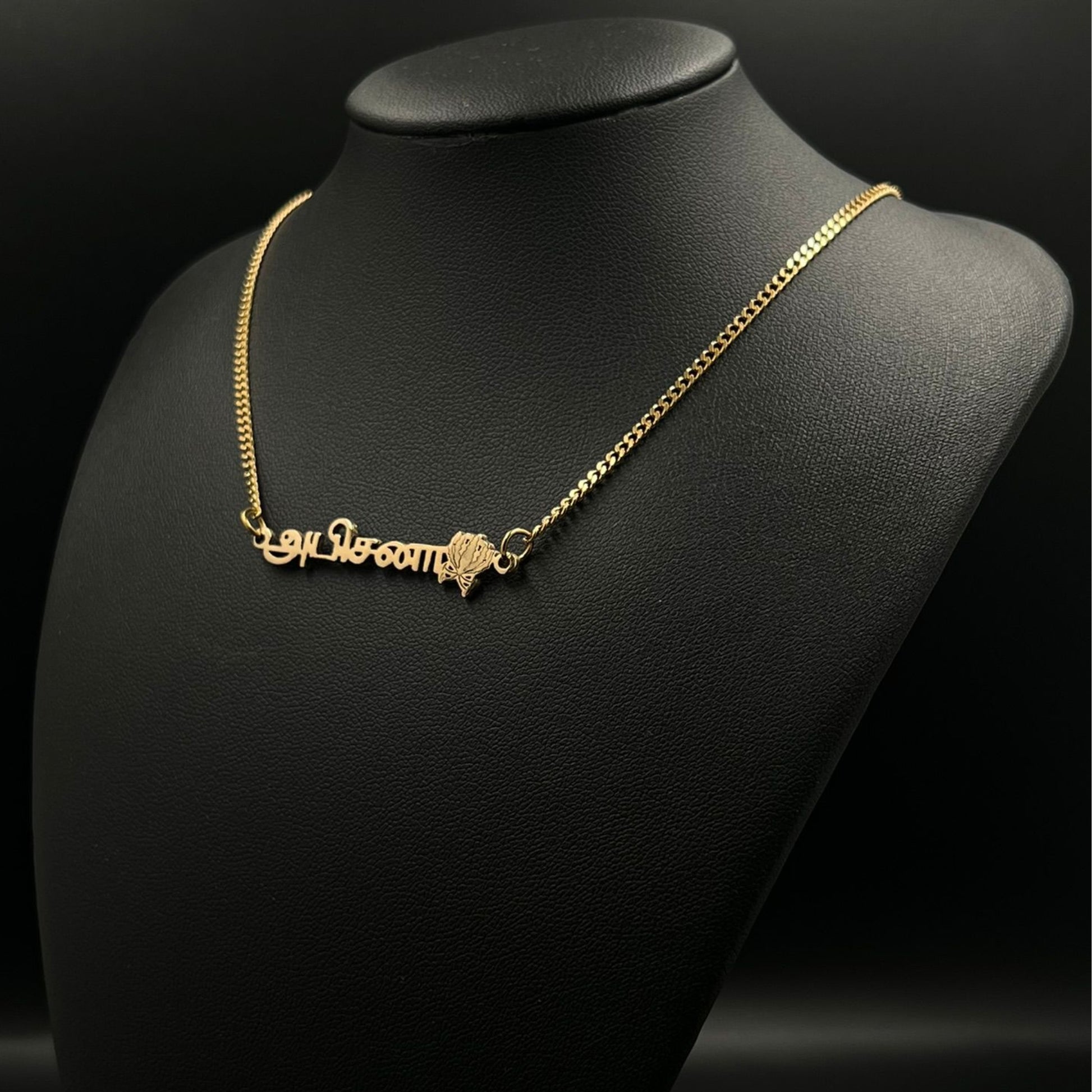 The necklace is 18-carat gold or rhodium-plated and features your name with the Karthigai flower.