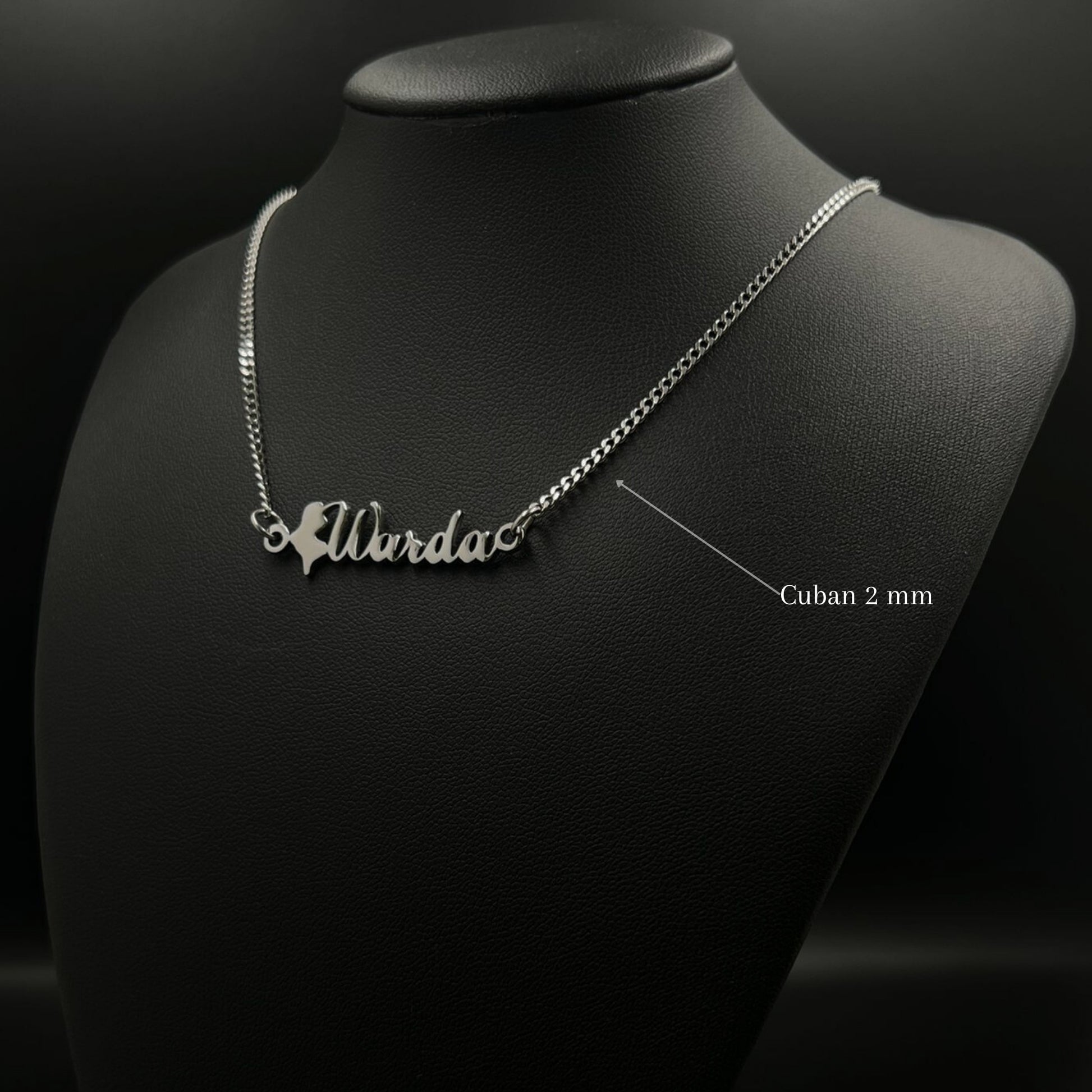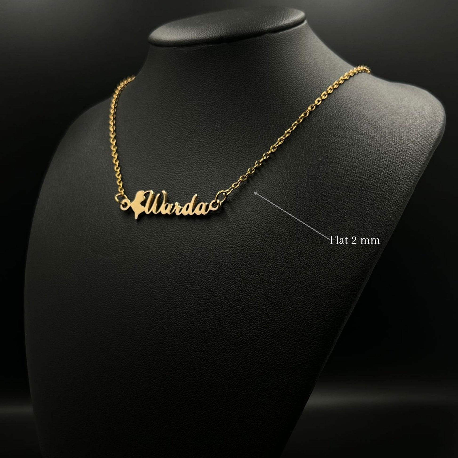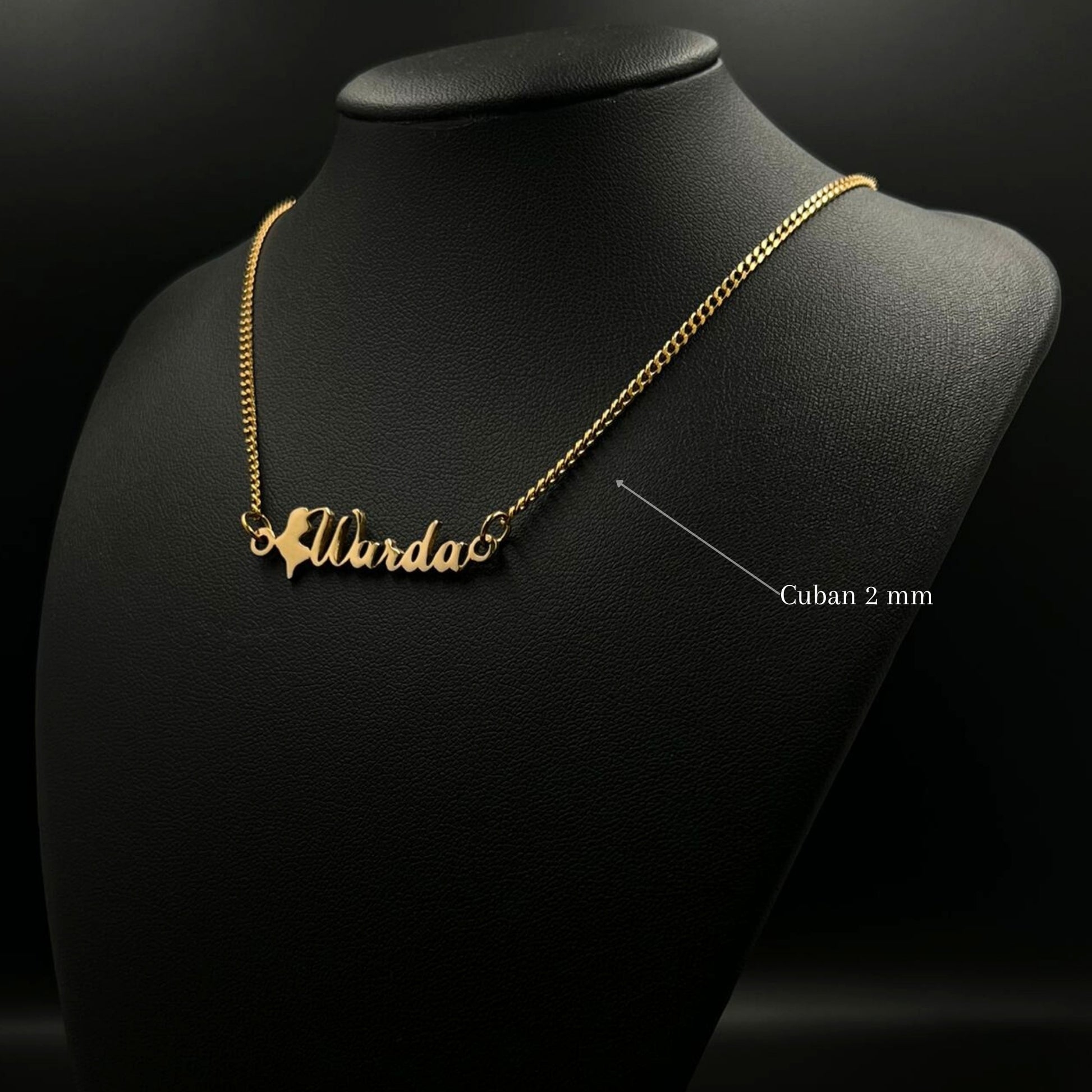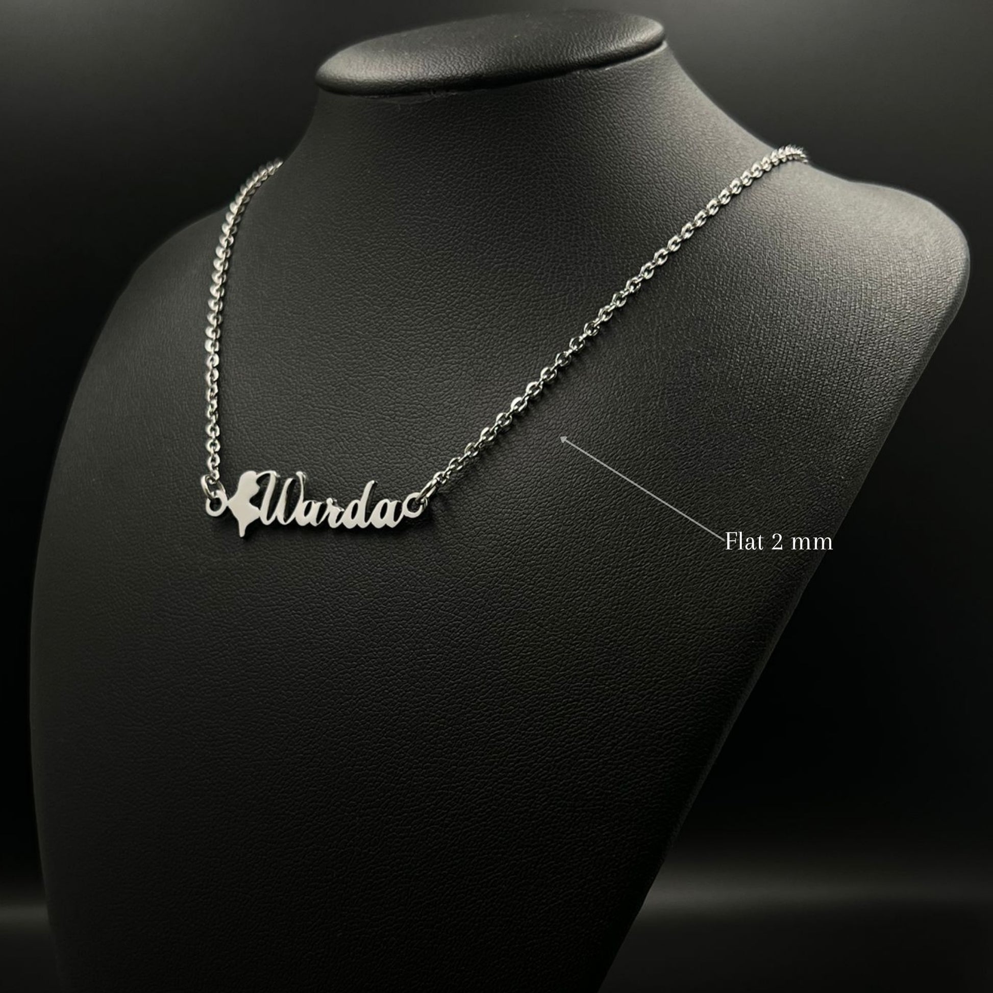 The necklace is 18-carat gold or rhodium-plated and features your name with the Tunisia map.