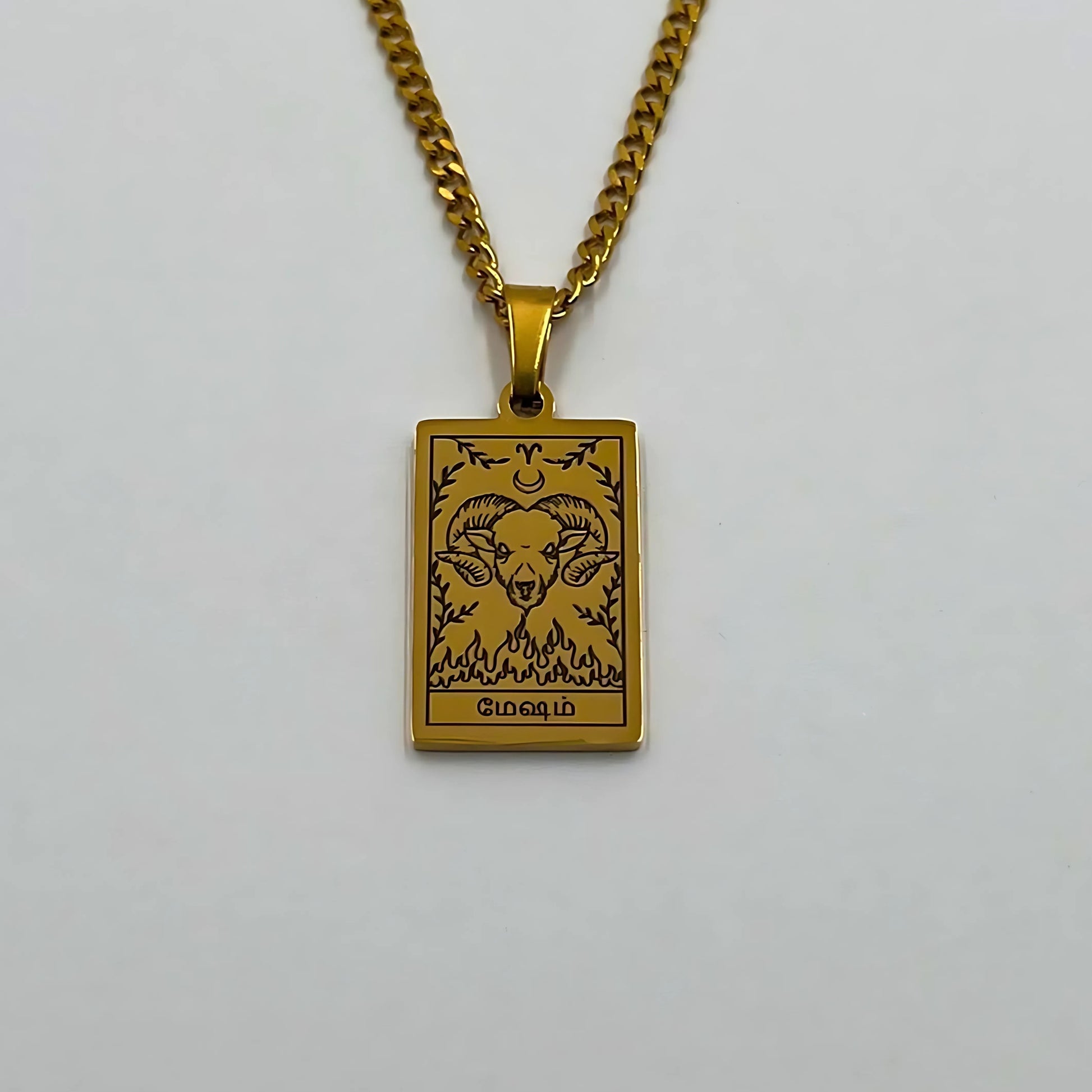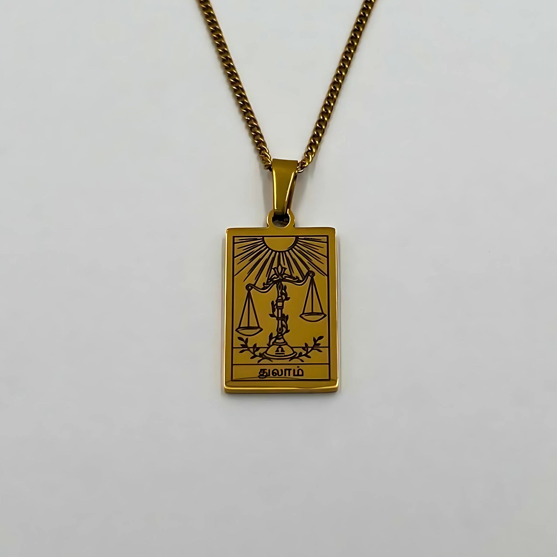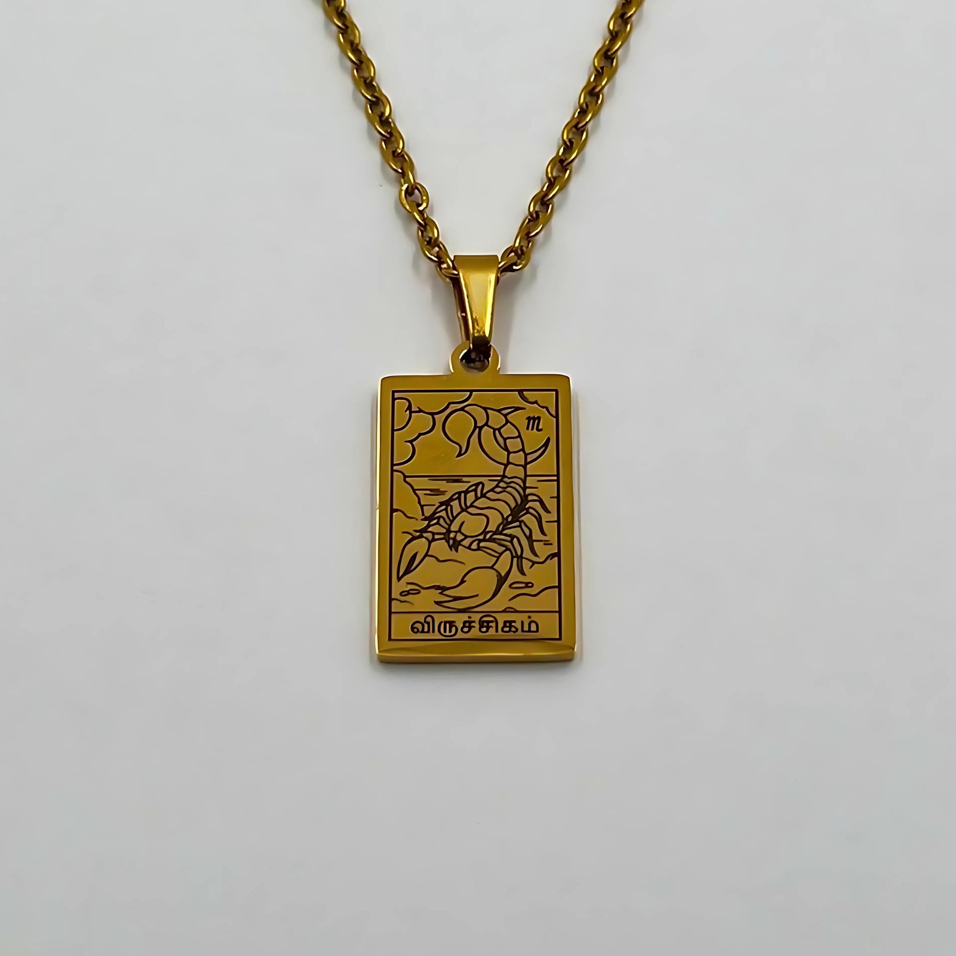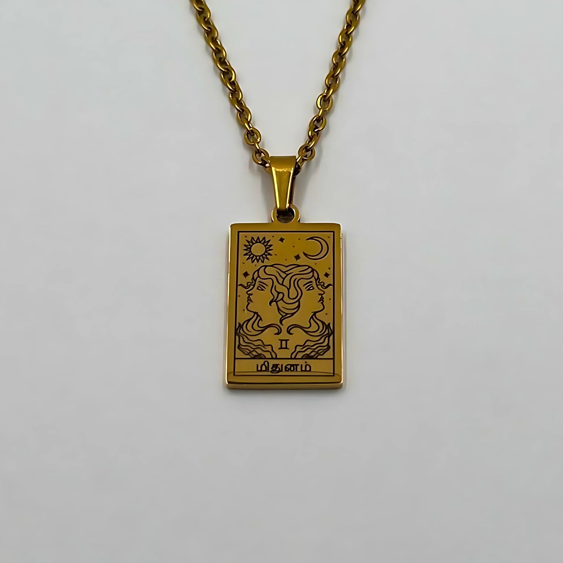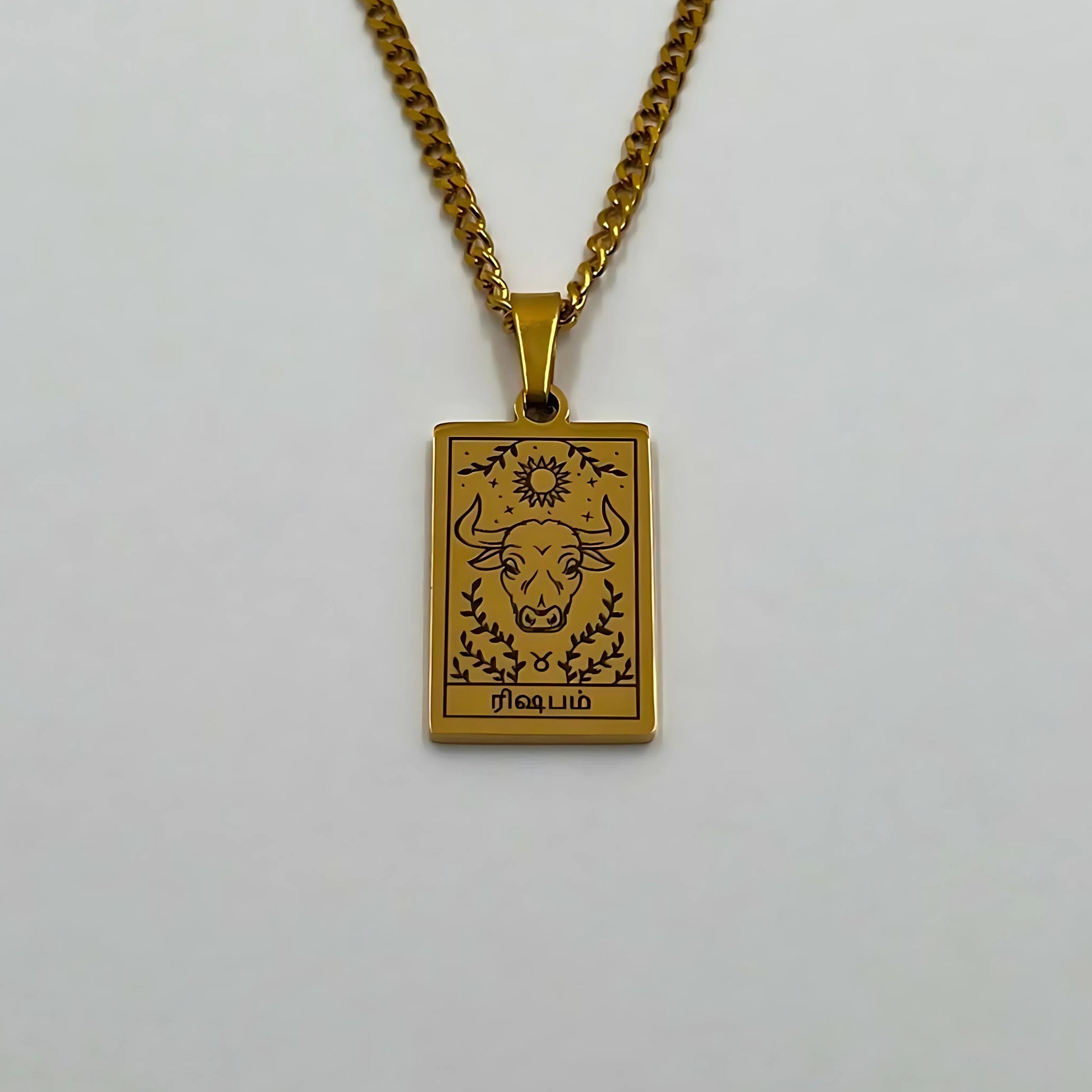 The necklace and pendant are made of stainless steel, plated with 18-carat gold and depict the Tamil zodiac signs.
