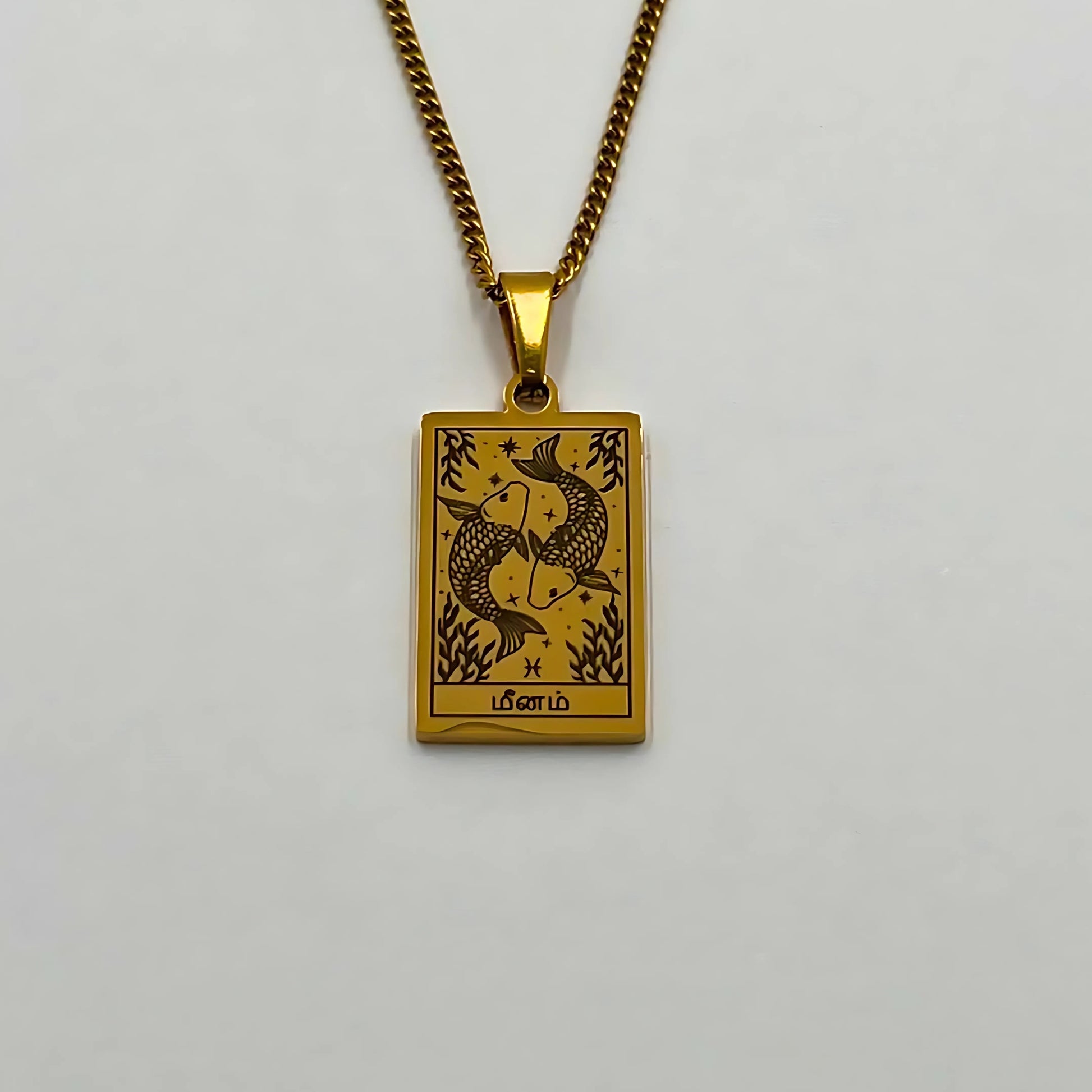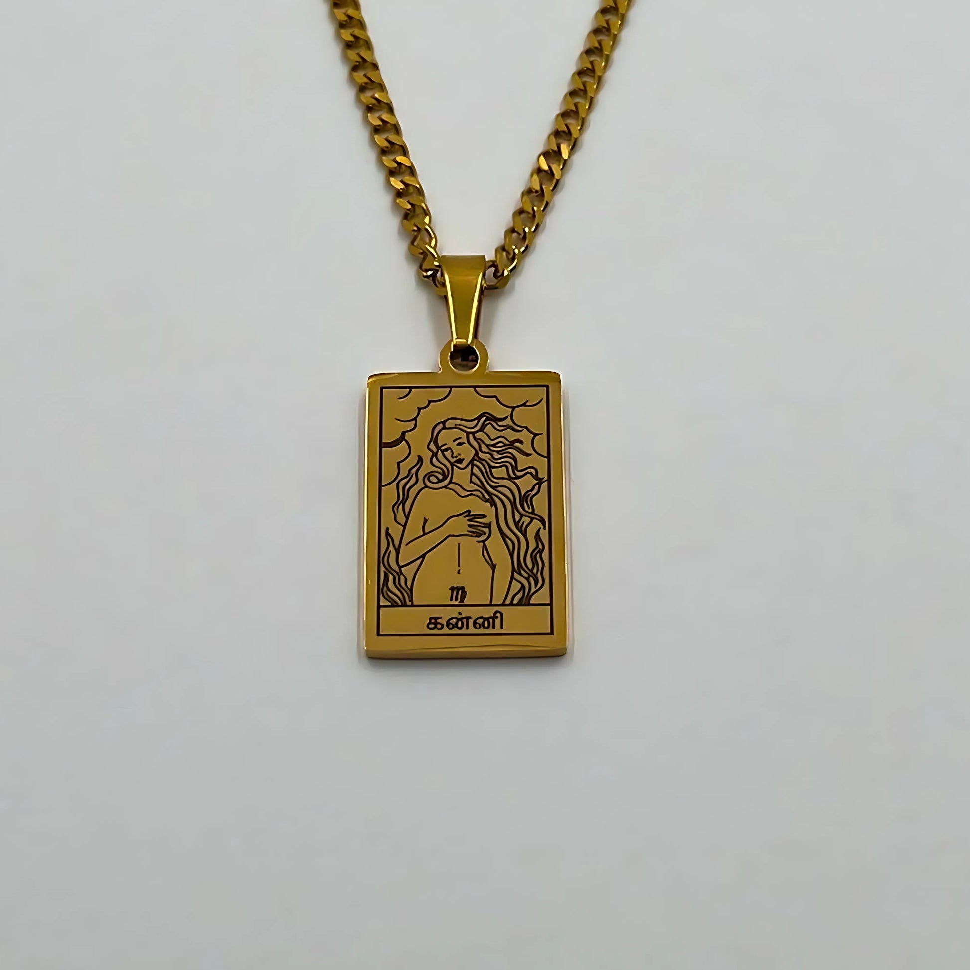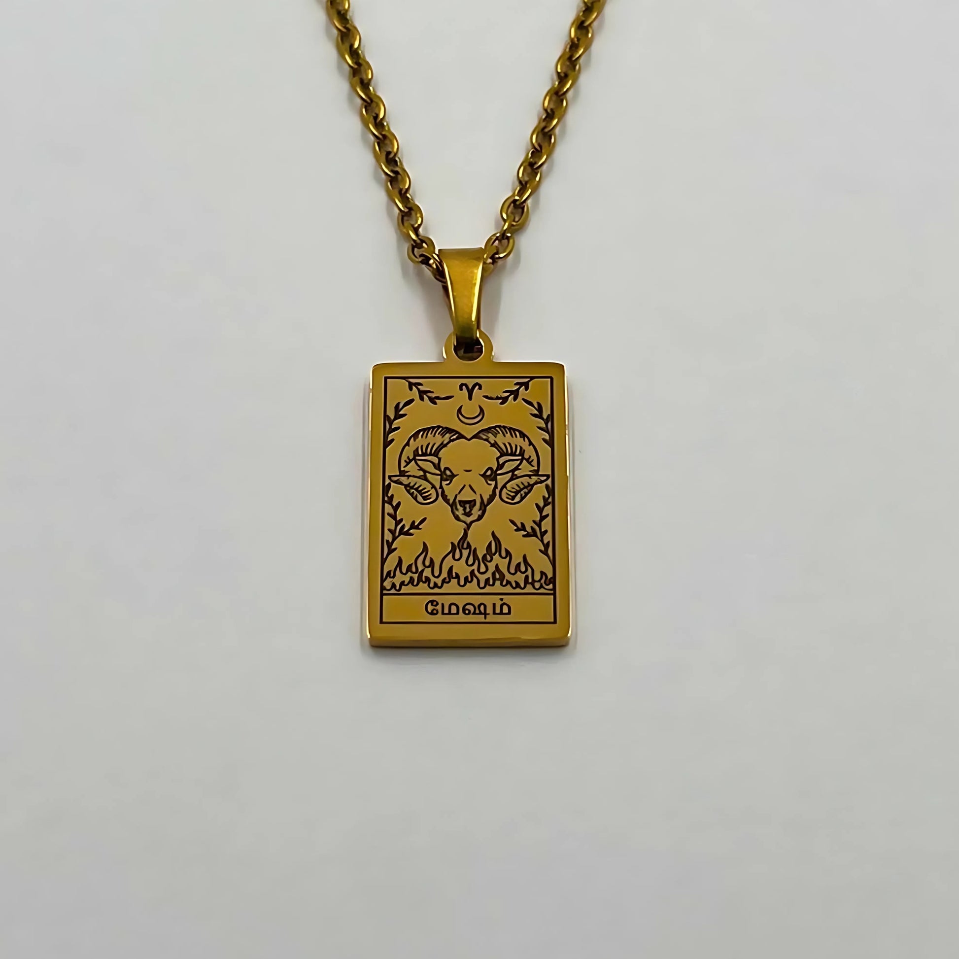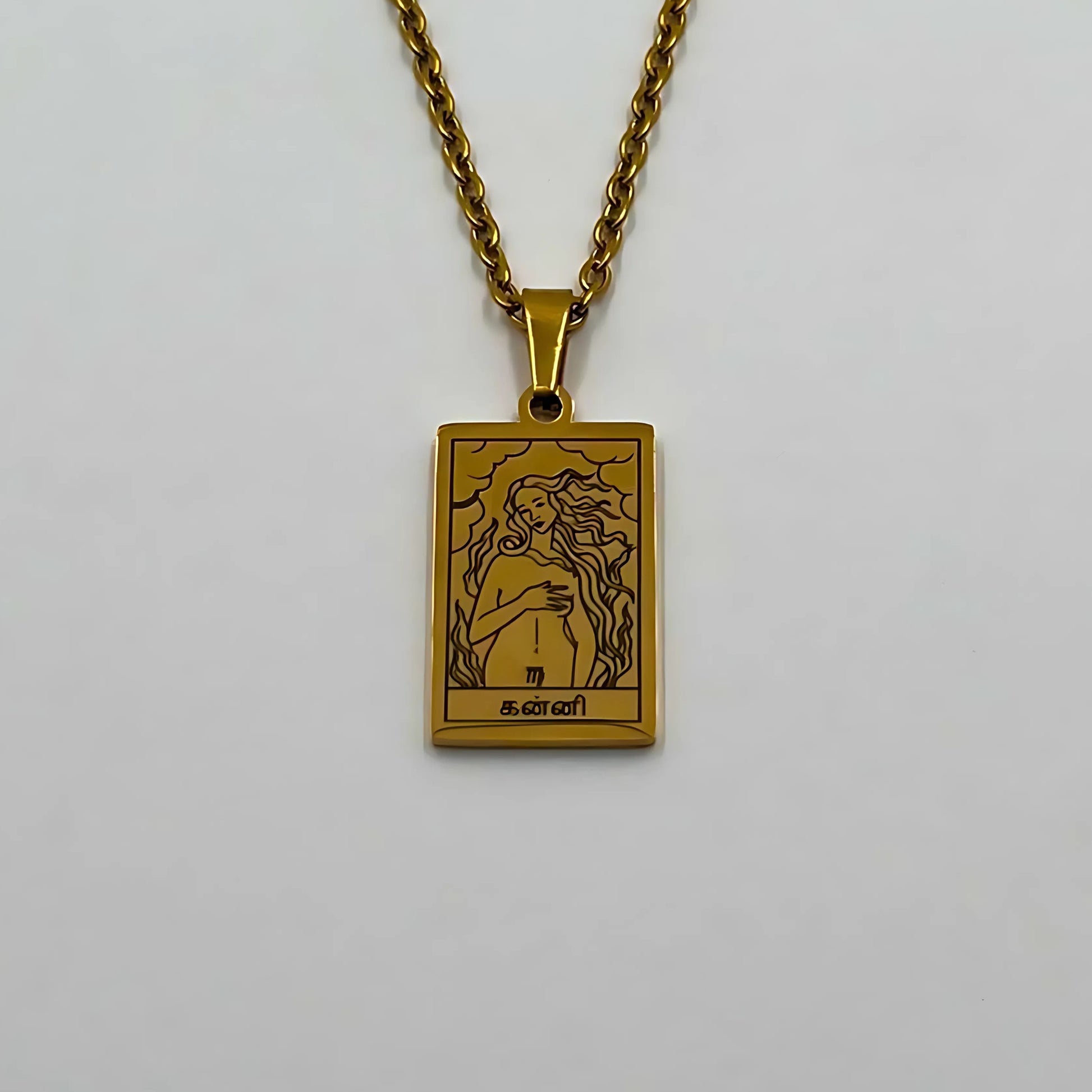 The necklace and pendant are made of stainless steel, plated with 18-carat gold and depict the Tamil zodiac signs.