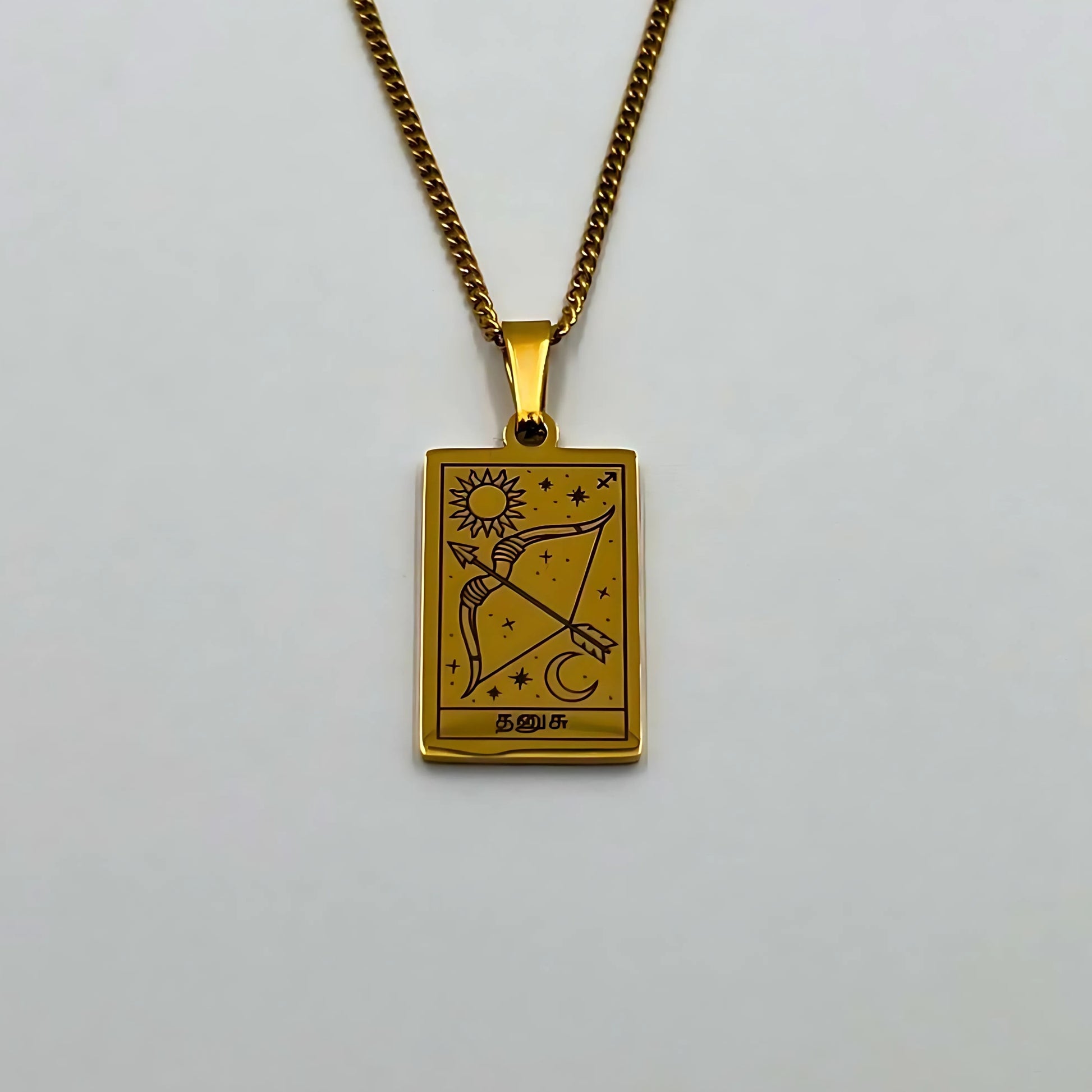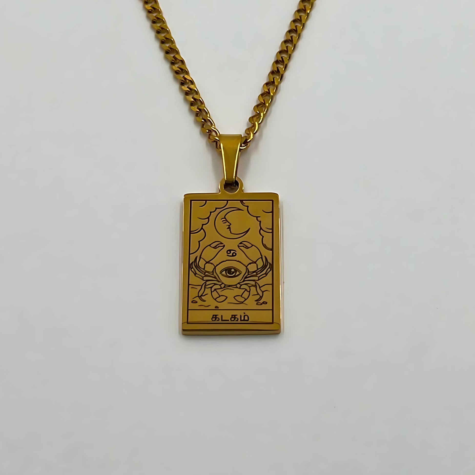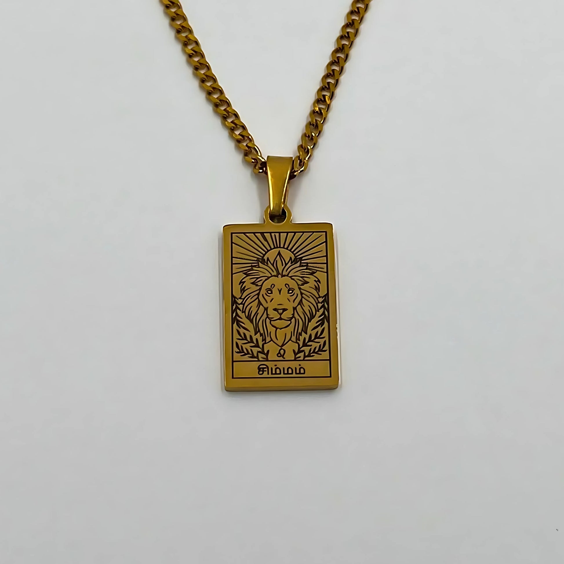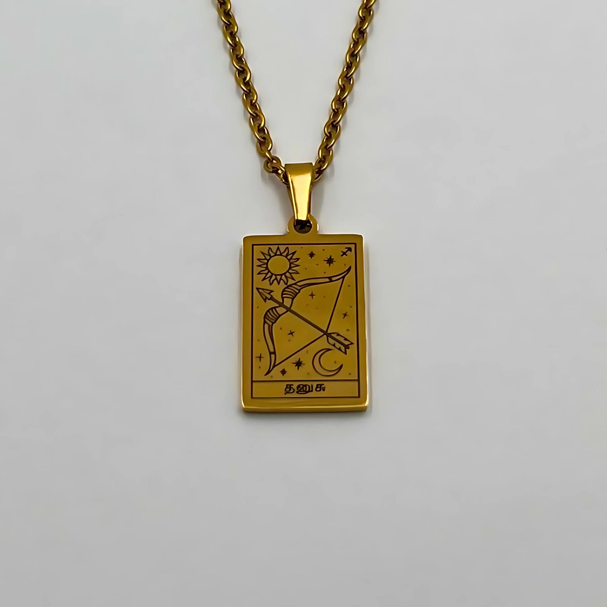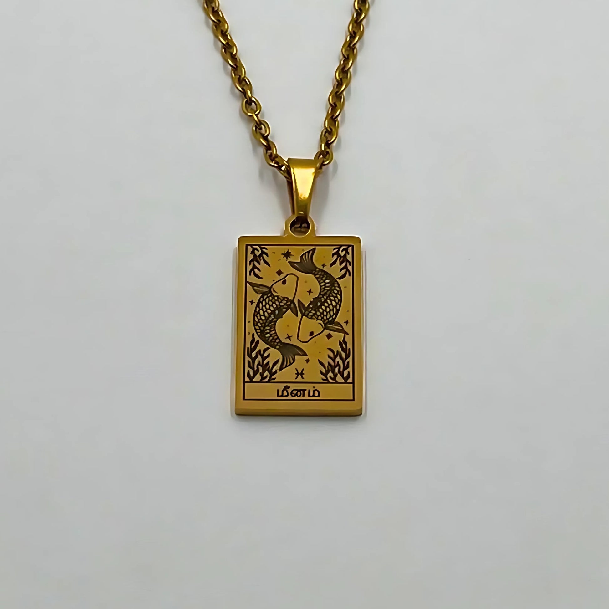 The necklace and pendant are made of stainless steel, plated with 18-carat gold and depict the Tamil zodiac signs.