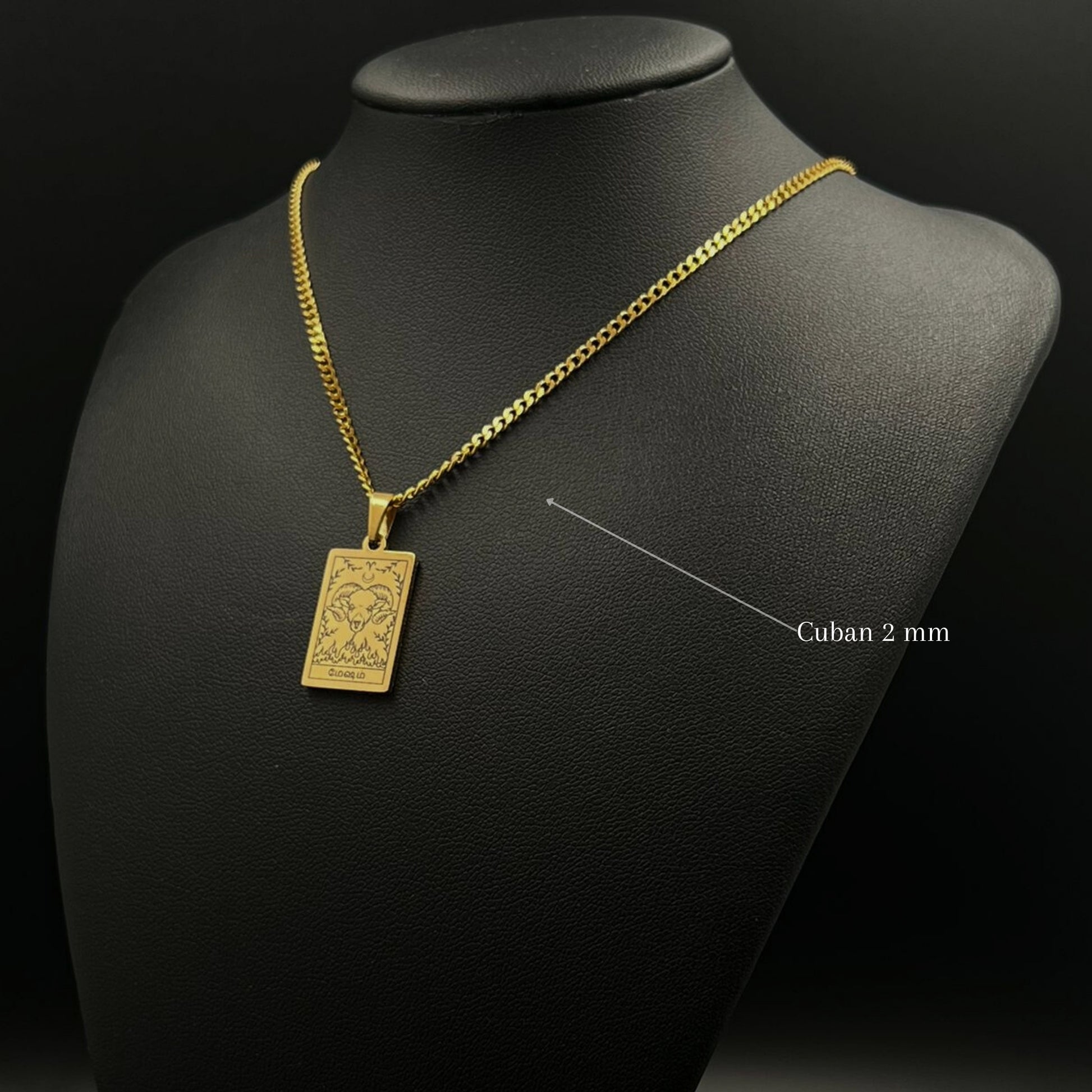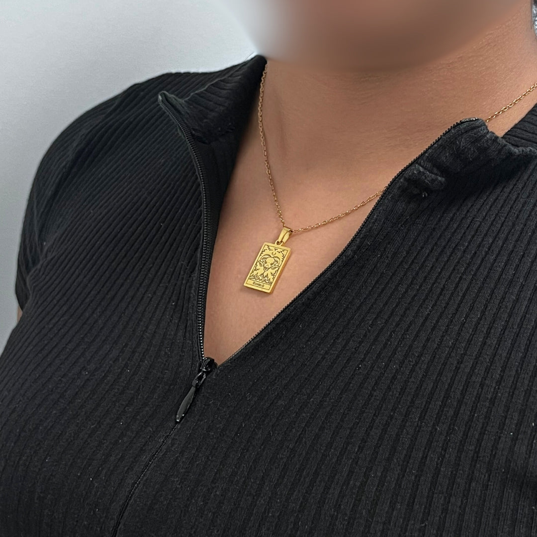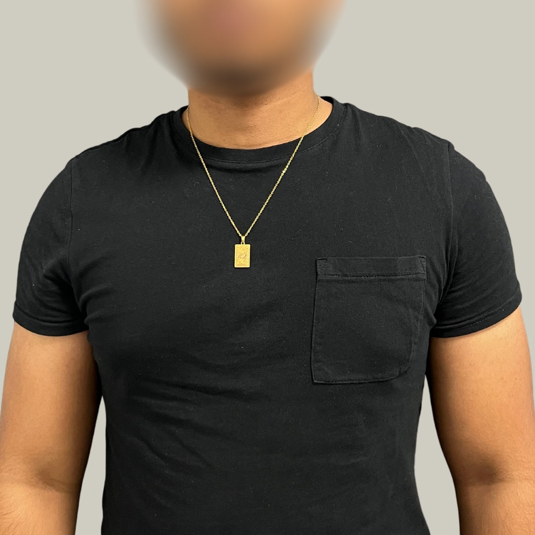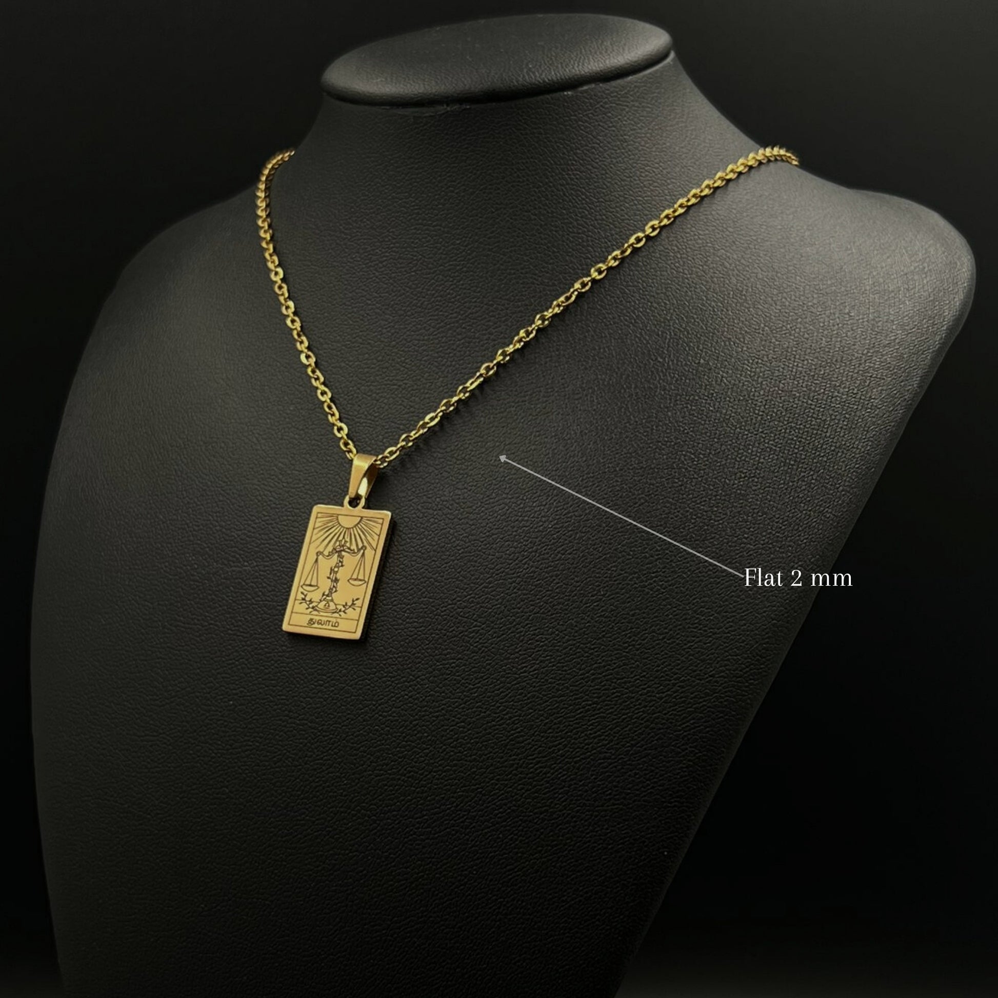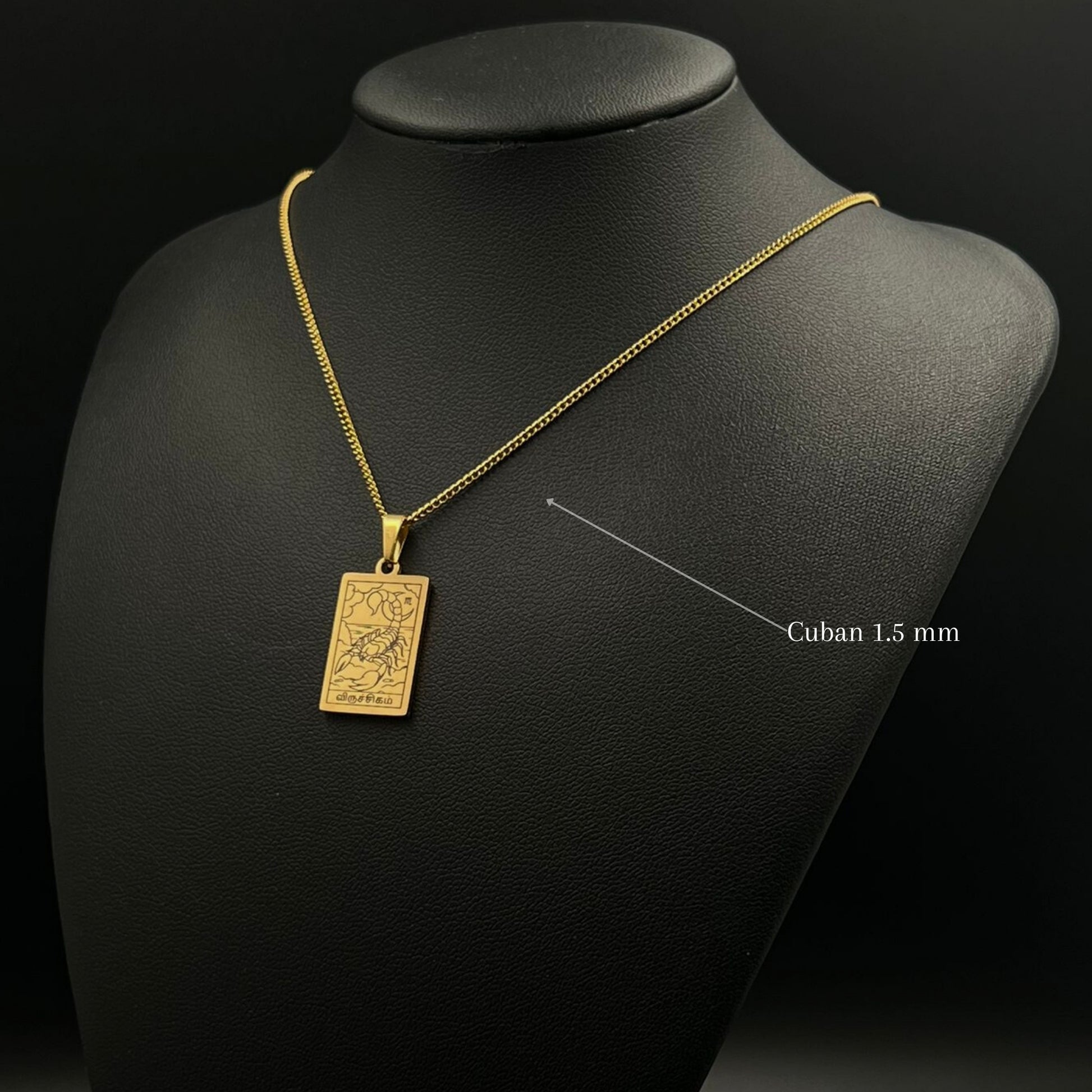 The necklace and pendant are made of stainless steel, plated with 18-carat gold and depict the Tamil zodiac signs.